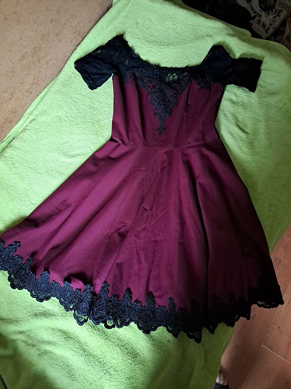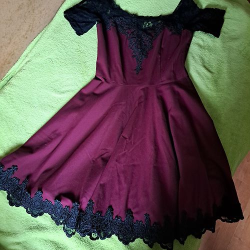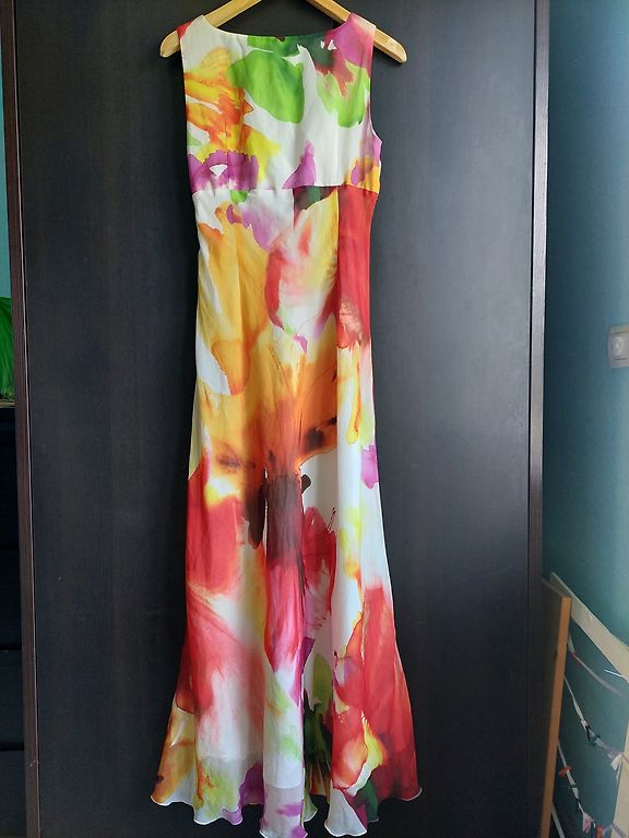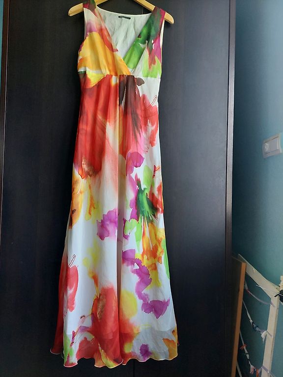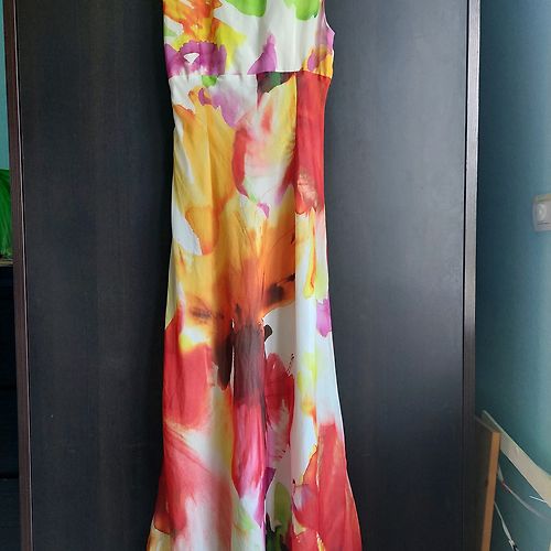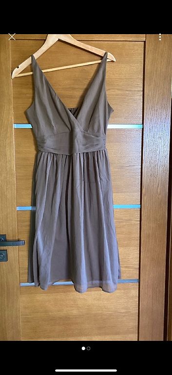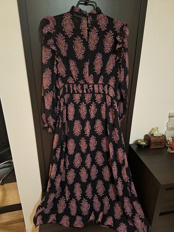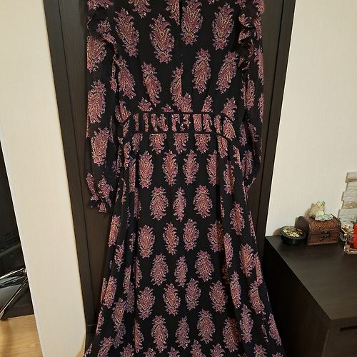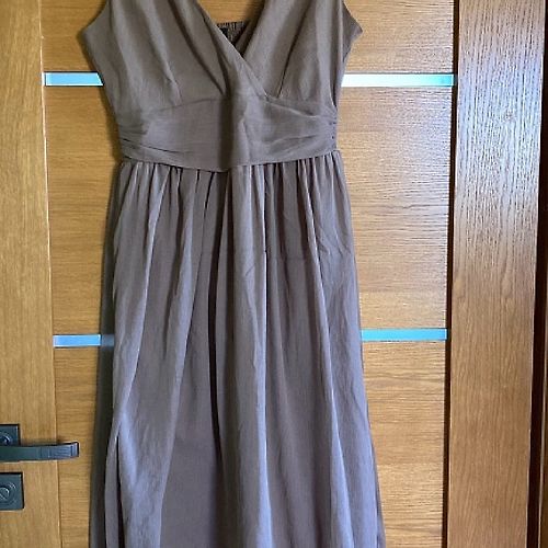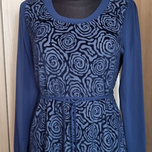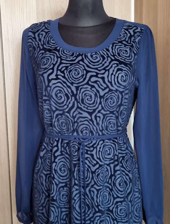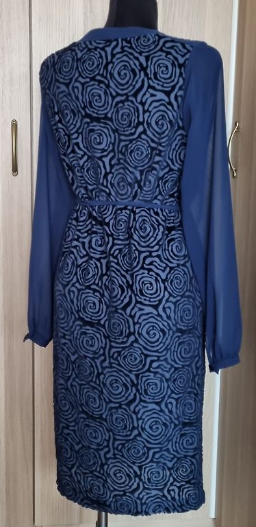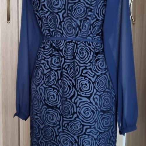 Eleganta Expresso, šifona/samta midi kleita. Kleitas audums ir elastīgs, piedurknes šifona. Platums padusēs 48,5cmx2, platums gurnos 51,5cm, garums 102-103cm, piedurknes 63-64cm. Kleita ir brīva/taisna piegriezuma ar smalku šifona jostiņu. Uz kleitas ir M izm. Atbilst M izm. Derēs arī uz M/L. Praktiski nevilkta. Vizuāli kā jauna. 9EUR