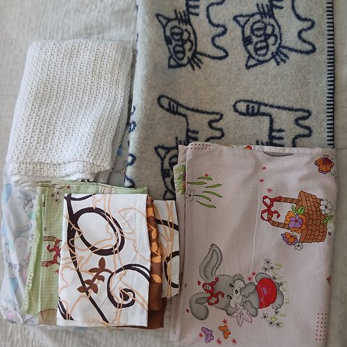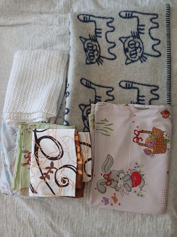 Vilnas sega, tamborētā sedziņa, palags un spilvendrānas. Dāvinu:)