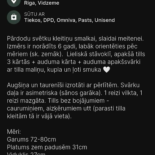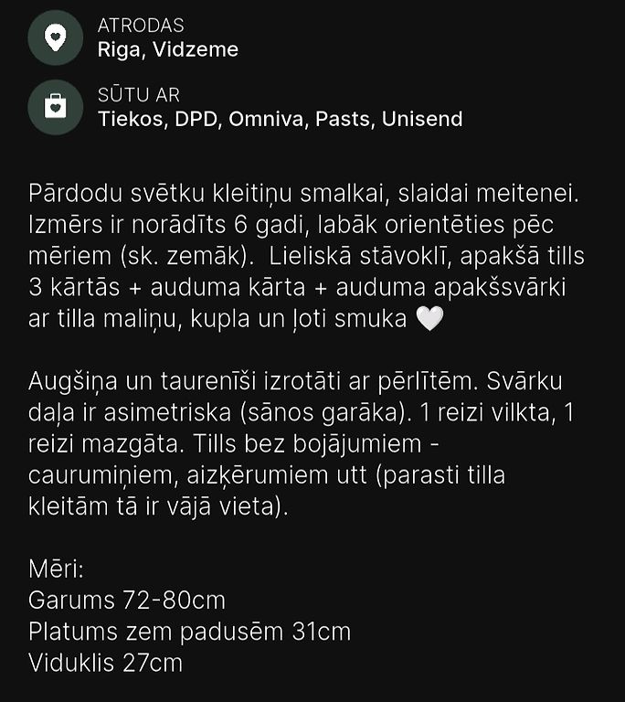 tatjana-grossmaneToday, 11:54Labdien, varu piedāvāt šādu kleitiņu, pirkta 6g. vecai meitenei, bet sludinājumā ir norādīti mēri - labāk vadīties pēc tiem, jo kleita ir domāta smalkai meitenei un visticamāk arī 5g. var derēt. Today, 11:54