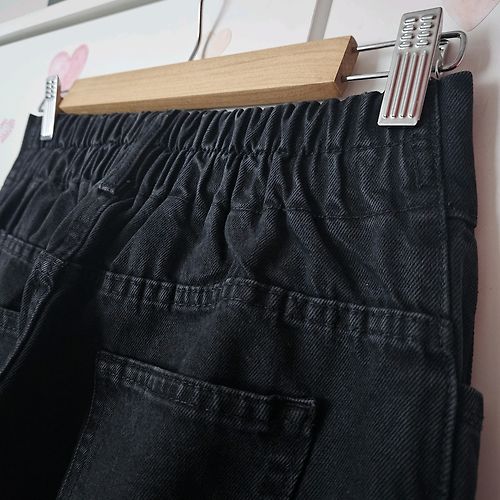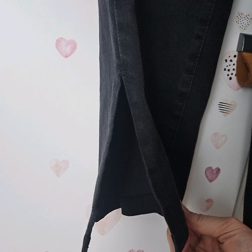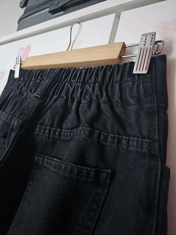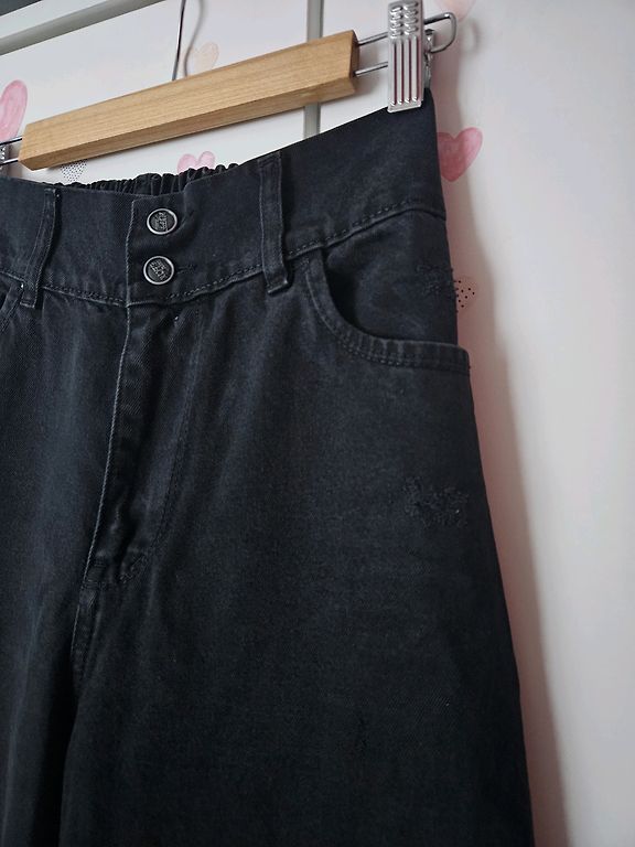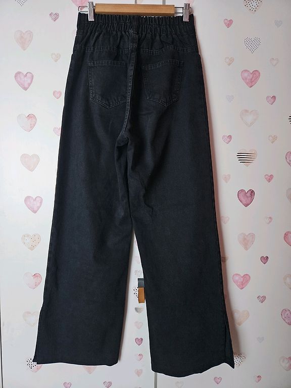 Wide leg džinsu bikses. Jostasvietā aizmugurē gumija, kas biksēs liek justies fantastiski ērti un izcili der viduklī. Bikšu galos nelieli šķēlumi. Augstā jostasvieta.