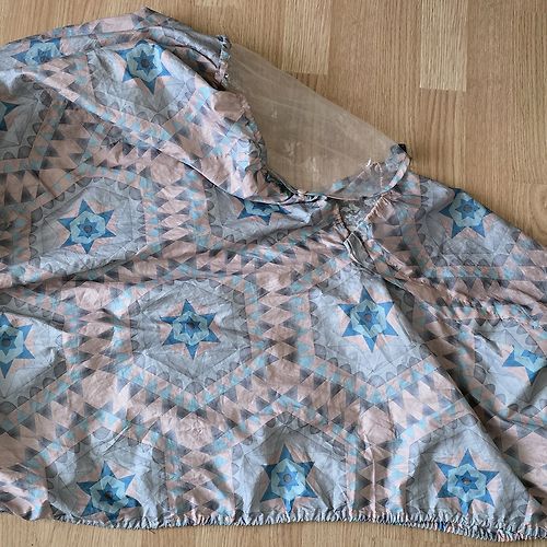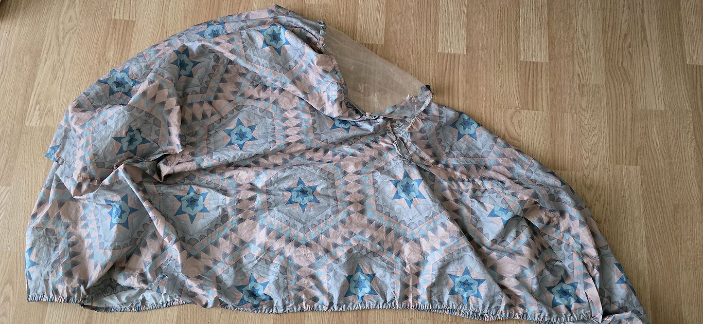 Piedzīvojusi vairākus īpašniekus un ratus. Varbūt kāds vēlas to vēl lietot kā aizsardzību no vēja, pasargās arī no nelielas īsas smidzināšanas. Ilgstošā lietū to lietot nevajadzētu, jo iekšējā kārta ir bojāta un man nav pārliecības, ka tikai ārējā kārtīgi pasargās. Gumijas izirušas un vairs nesavelk - ir iespējams ievilkt jaunas (zinu, jo paziņa savulaik savai plēvei bojātās gumijas nomainīja)