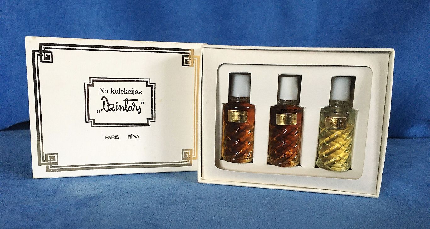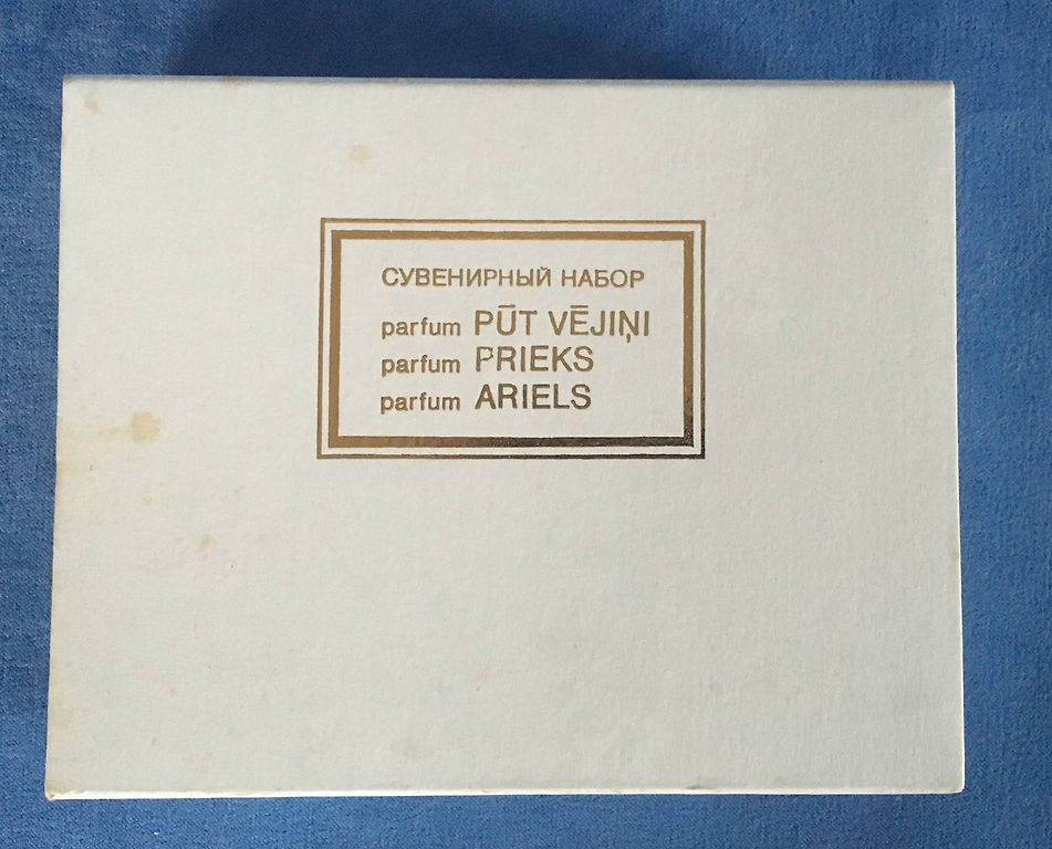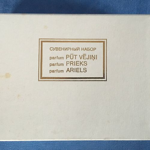 2) Suvenīru smaržu komplektu no 80-gadiem no kolekcijas Dzintars. Komplektā - Prieks, Ariels un Pūt vējiņi. Smaržas nav lietotas, bet smaržām Ariels neliels smaržu zudums, iespējams, no ilgstošas glabāšanas. Smaržu kastīte nav saplēsta, ir nelieli pleķīši, kuri redzami foto.