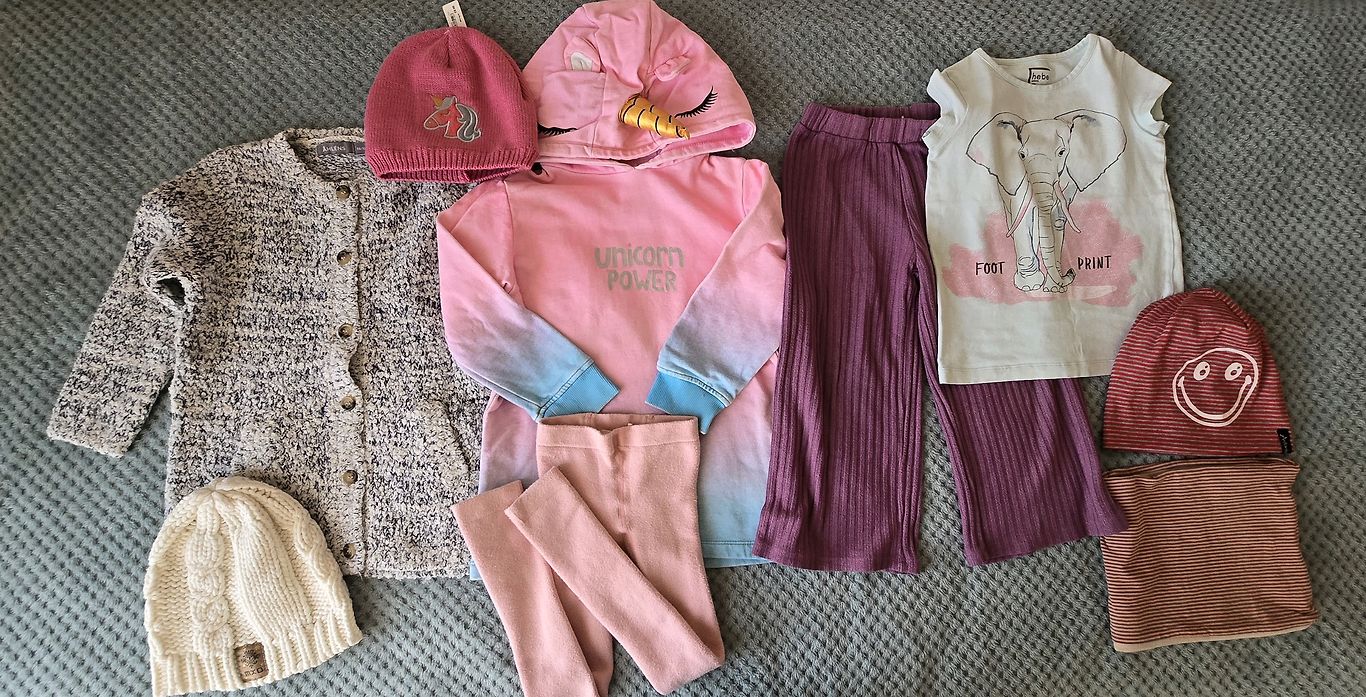 Atdodu meitenei apğērba komplektu uz aptuveni 104.izmēru (kaut kam norādīts lielāks izmērs un tas derēs ilgāk, bet mūsmājās derēja sākot no 104). Drēbes labprāt vilktas, vienradža džemperim (pagarināts) ir traips un hebe krēsliņam ar ziloni arī.