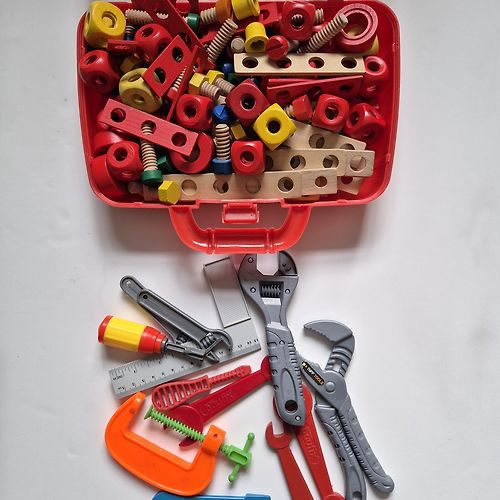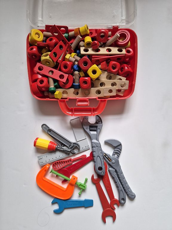 Mazam puikam koka konstruktors ar skrūvēm un plastmasas darbarīku komplekts. Viss lietots, plastmasas rīki ir nomazgāti, koka konstruktors būs jānotīra pašiem. Sarkanais koferītis arī nāk komplektā.