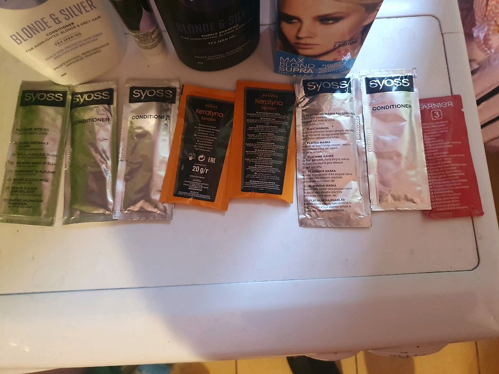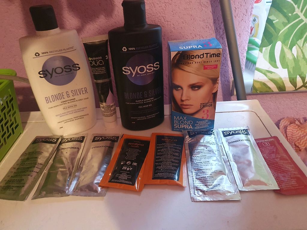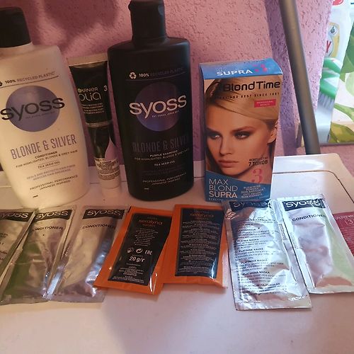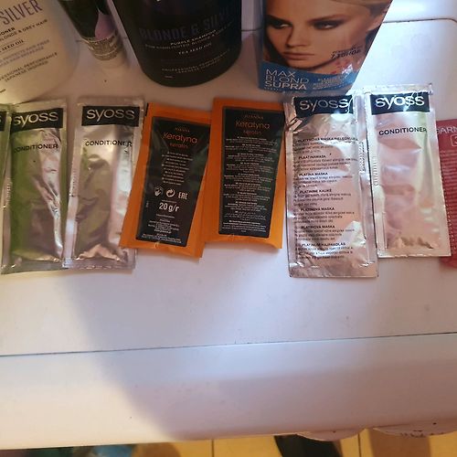 Varbūt kādai noder. Balinātājs atvērts šodien un nesen tikai nopirkts. Vajadzēja priekš divām šķipsnām un palika pāri daudz. Viena pulverīša paciņa neatvērta. Otrā vēl puse. Ļoti gribētos atdot visu kopā jo matus esmu nolēmusi likt mierā. Pārējās visas paciņas neatvērtas- kondicionieri un platīna maskas. Šampūns gandrīz pilns. Kondicionieris aptuveni puse. Varu sūtīt arī