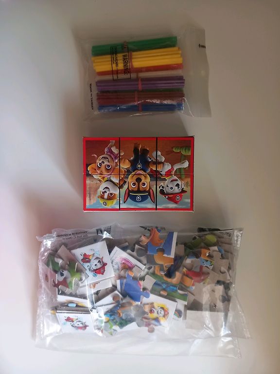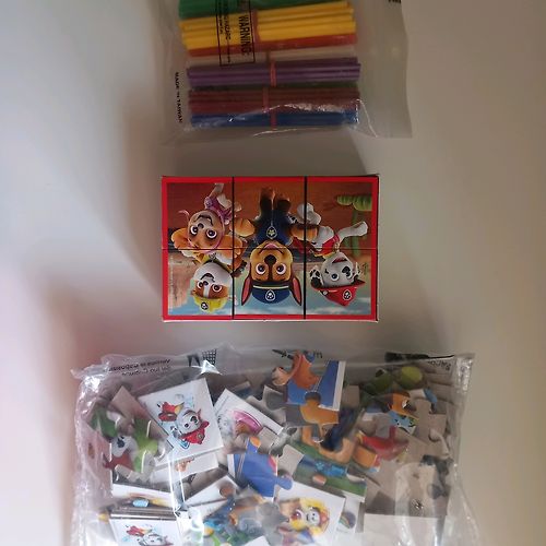 Vairums mantiņu un spēļu ir lietotas. Paw patrol puzles+memo ir jauns. Uzdevumu grāmatas vaurumā tukšas, varbūt kādā pāris lapas izpildītas tik. Rīga, Torņkalns.