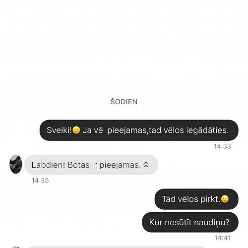 Intereses pēc gribēju iegādāties,atbildēja,ka prece pieejama,un atsūtīja aizdomīgu kontu nr,pēc kā uzreiz preci izdzēsa un saraksti slēdza!