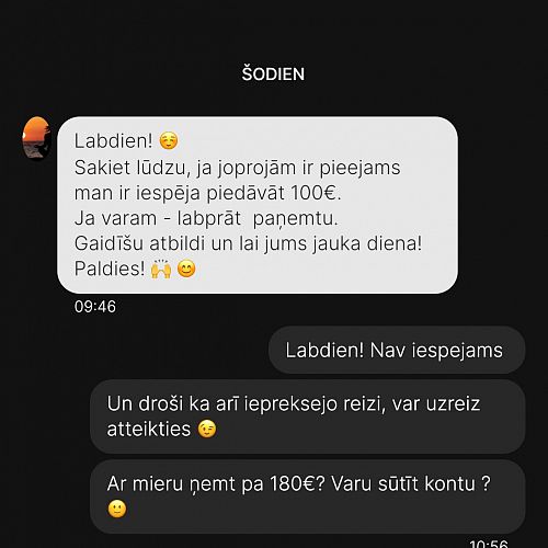 Naja KonicaSan-vakar, atnākot no darba nosūtīju prasītos konta datus un visu dienu gaidu pārskaitījumu,līdz izdomāju paskatīties.Klusi un bez ziņas ir ATTEICĀS.