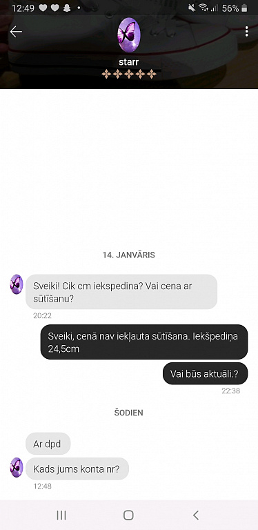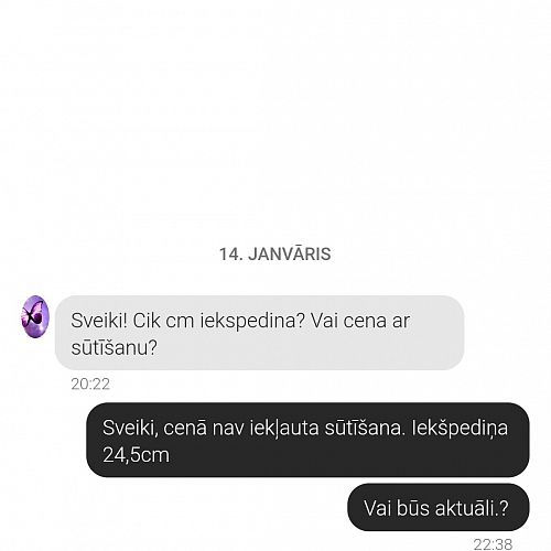 Jauna smadzeņu čalkarētāja lolita-l .Pieteicās pie somas 11,01,22,un uzreiz paprasija atlaidi,iedevu-Paprasija kontu ,aizsūtiju .Un tad sākās vai nav defektu ,papildus bildes .Es kā muļķe fočeju no visām pusēm.lai gan aprakstā bija viss uzrakstīts un klusums.Šodien redzu ienākusi izlasijusi un klusums.Nesaprotu cilvekus,nu ja pārdomā uzraksti ,bet nečakarējies,Meitenes mans ieteikums -skataties lolita-l