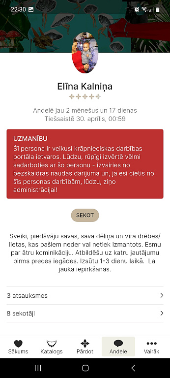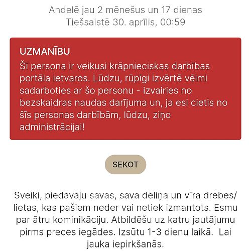 Stāsts sekojošs- pieteicos precītei, uzdevu jautājumu, pārdevēja pieklājīgi un smalki atbildēja. Nekas nelika domāt, ka uzķeršos uz krāpnieces. Mana kļūda, ka nepaskatījos, ka uz to brīdi profils bija dažas dienas tikai un nevienas atsauksmes vēl nebija. Arī brīdinājums par krāpniecību nebija. Parasti izpētu, bet šoreiz kaut kā neienāca pat prātā.