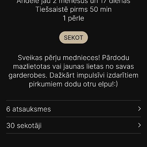 Taču dažas pārdevējas gan uzvelk pamatīgi. Un šeit mazliet nesaprotu, vai problēma ir platformā un manas ziņas fiziski neaiziet pārdevējām vai notiek vienkārši ignorēšana. Esmu vairākas reizes pieteikusies precēm, ka esmu gatava tūlīt pat pirkt, lai sūta konta nr (jā, pat bez jautājumiem par to, vai prece pieejama un defektiem 😃), un ziņa tiek vienkārši ignorēta. Pārdevāja nāk online, prece stāv kā stāvējusi, bet rodas iespaids, ka pārdot pati nemaz nevēlas🤦♀️