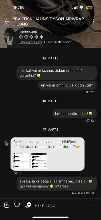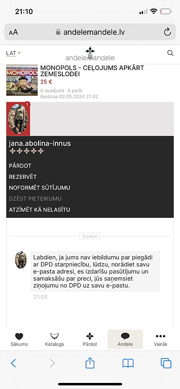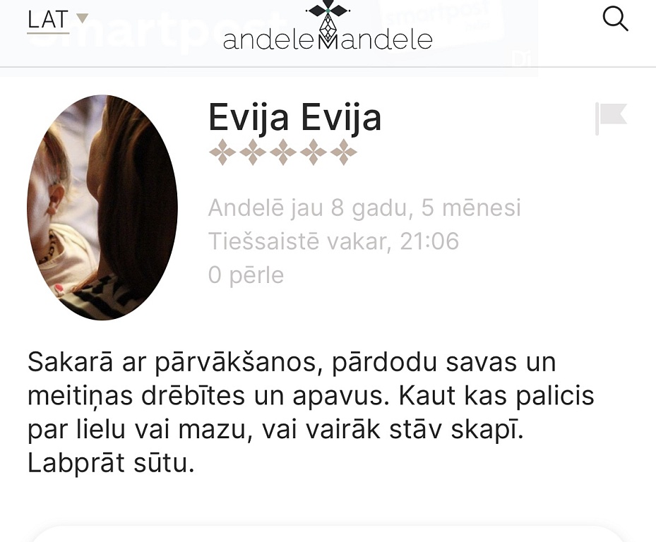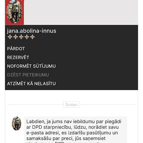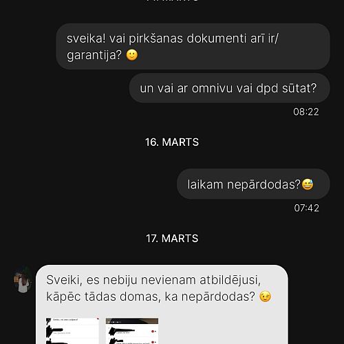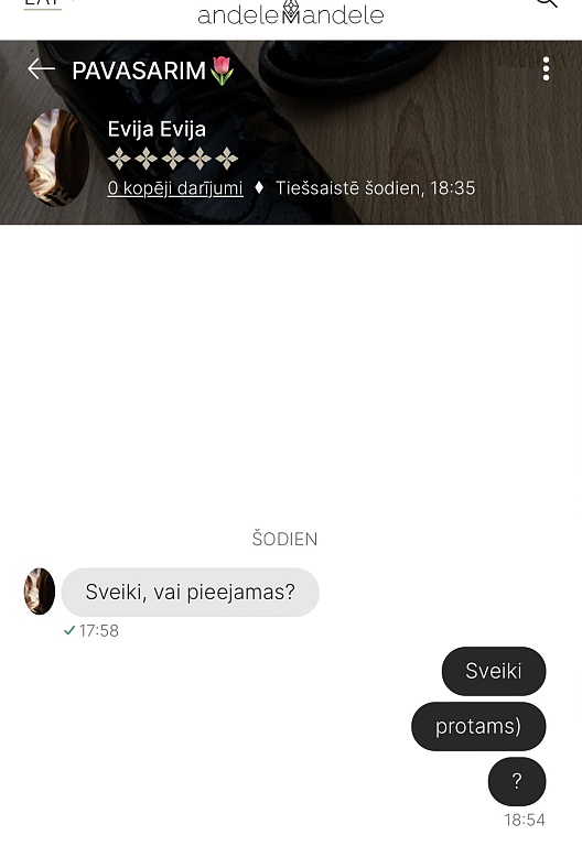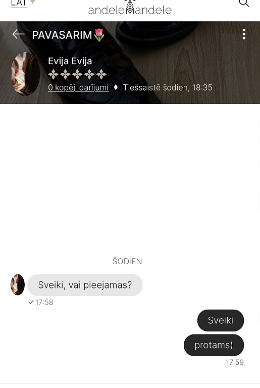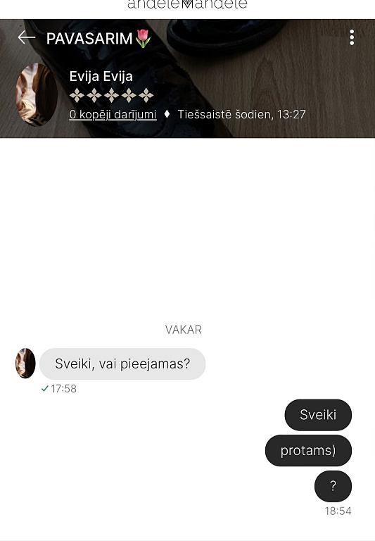 Es divas reizes no pircējām esmu saņēmusi ziņas,ka apģērbs neatbilst izmēram un neder- kad pajautāju,vai sludinājumu lasījāt un tajā norādītos mērus ar saviem salīdzinājāt,sekoja KLUSUMS! Tātad- vienkārši ierauga bildi,iepatīkas un tik pērk,pat neizlasot aprakstu!👎