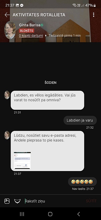 www.andelemandele.lv linda.ma Kārtējā dīkdiene, kas piesakās un tad nelasa ziņas un nekomunicē, nepārtraukti sēžot tiešsaistē un pieteikumu arī nedzēšot. Interesanti, ka pati ir pārdevēja - laikam, patīk šāda pircēju attieksme.