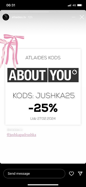 minkachuuu2 марта 2024 г., 12:18Hei! Ir kāds about you atlaižu kodiņš pieejams? :) 2 марта 2024 г., 12:18