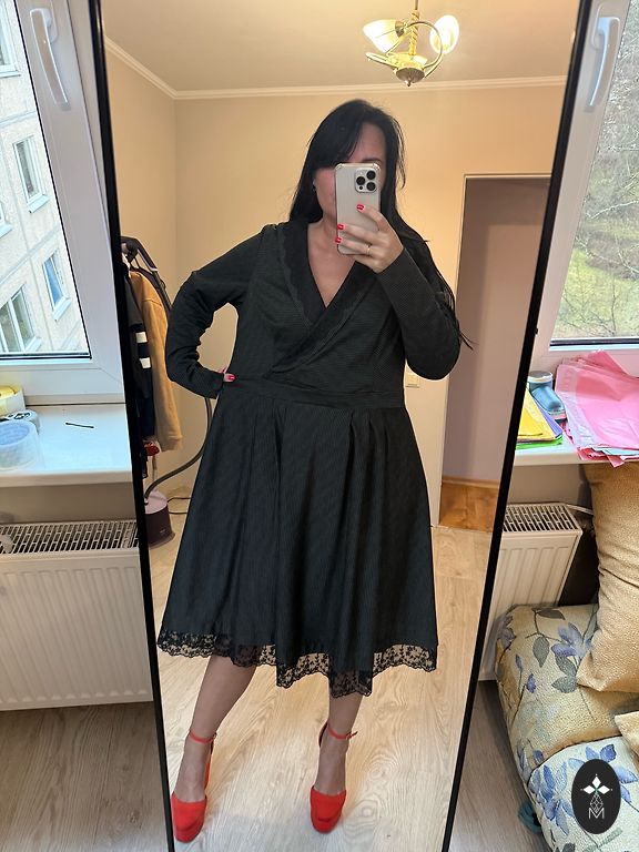 Rind 100 cm, talje 80 cm, puusad 30 cm, pikkus 112 cm. Kleit on voodriga.