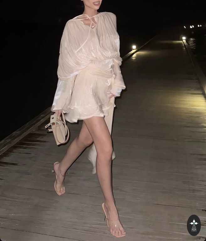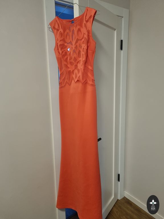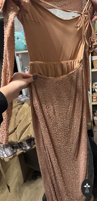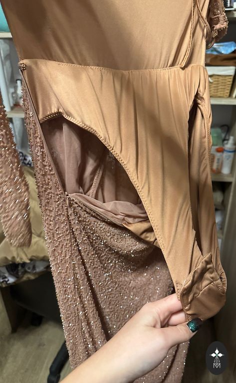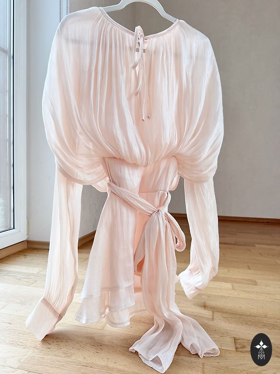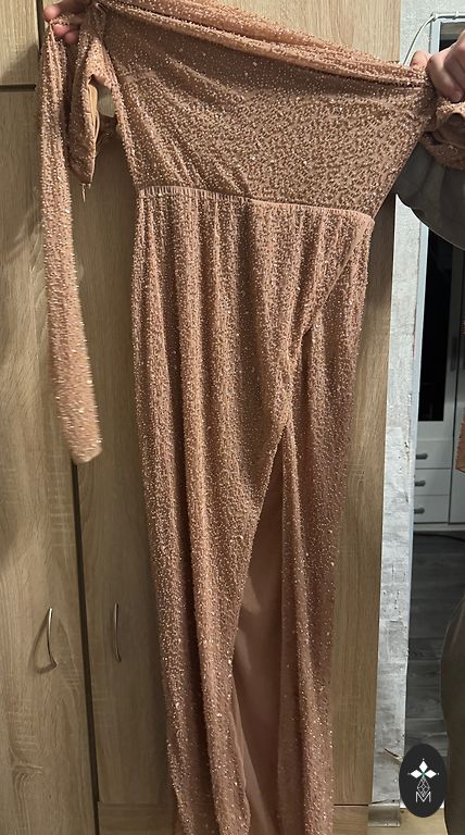 Labai graži, iškilminga suknelė ypatingam renginiui. Spalva priklauso nuo šviesos, kartais atrodo kūno spalvos, kartais labai šviesiai pudros rožinė.