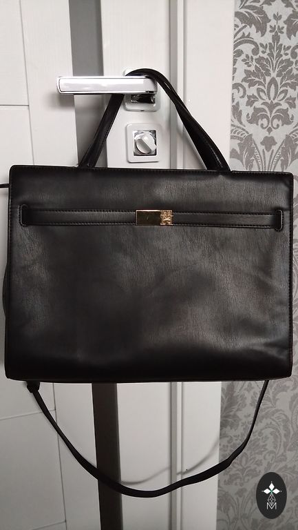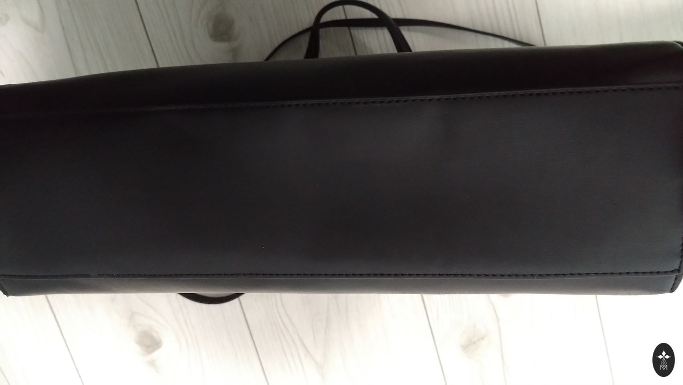 A large and very spacious bag (shopper). The bag length is ~42-43 cm, height ~34 cm, and the width of the bag's base is 15 cm. On the outside of the bag, there is a pocket with a zipper and a stamp. Inside the bag, on the sides, there is an inner pocket with a zipper, a compartment for a phone, and 2 connections, e.g., for an additional wallet or keys.