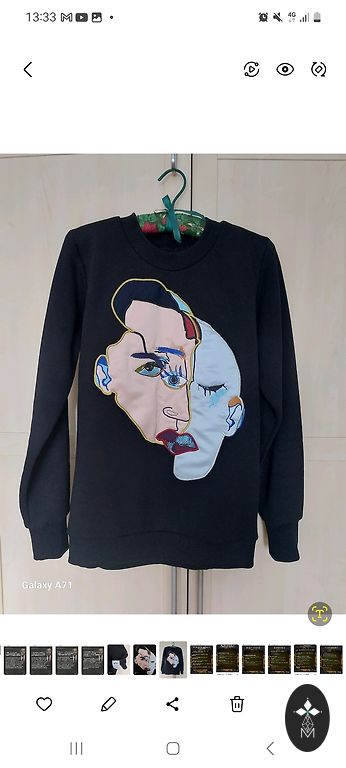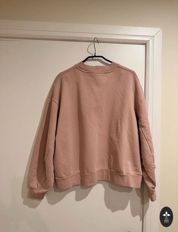 Väga pehme, lõdva lõikega kampsun, märgitud S, kuid väga suur. Laius kaenlaalustest 62 cm, pikkus kaelast 72 cm. Värv ei ole nii sinine, kui paistab, toon on soojem.