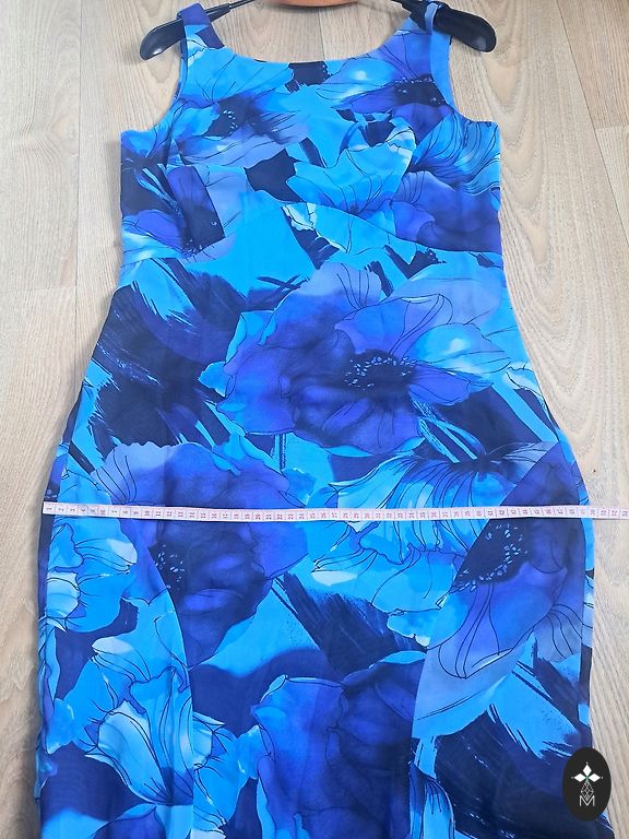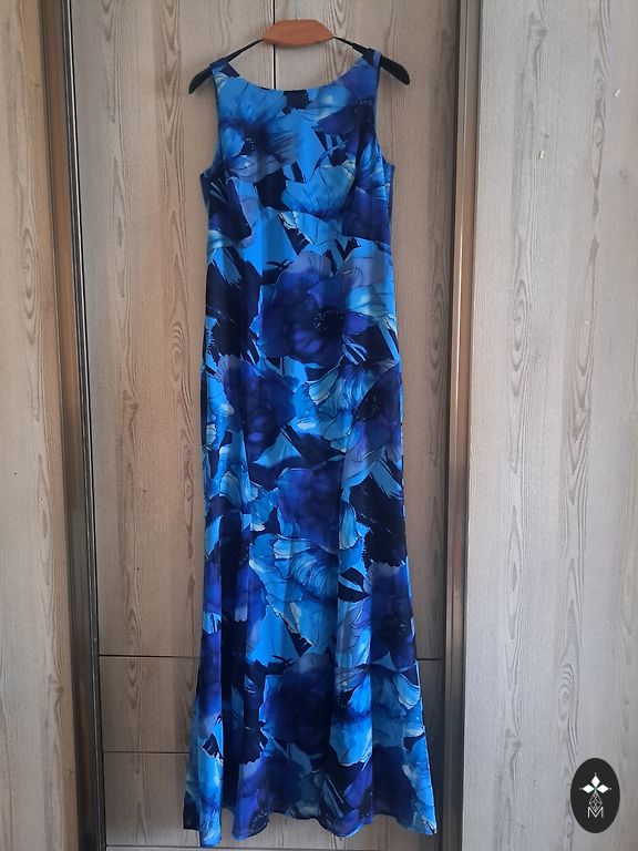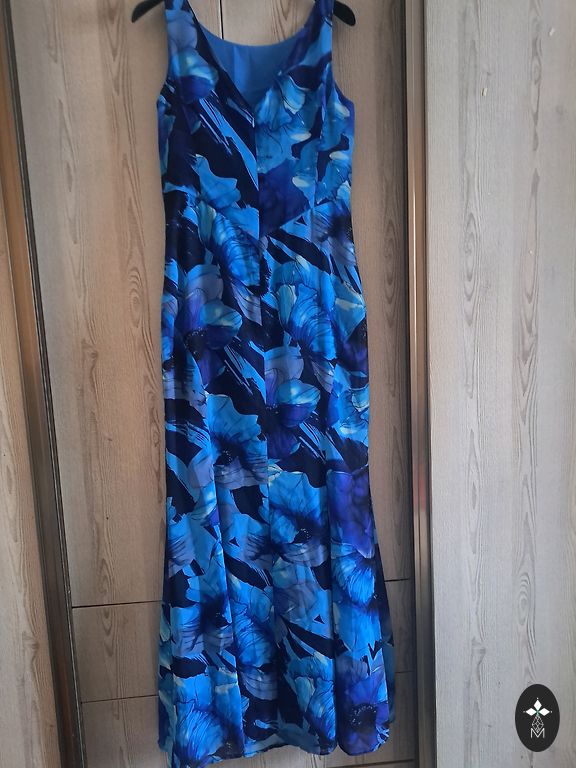 Blue jersey dress, size 36/38. In excellent condition. The fabric is slightly stretchy. Waist 33cm, length 97cm.
