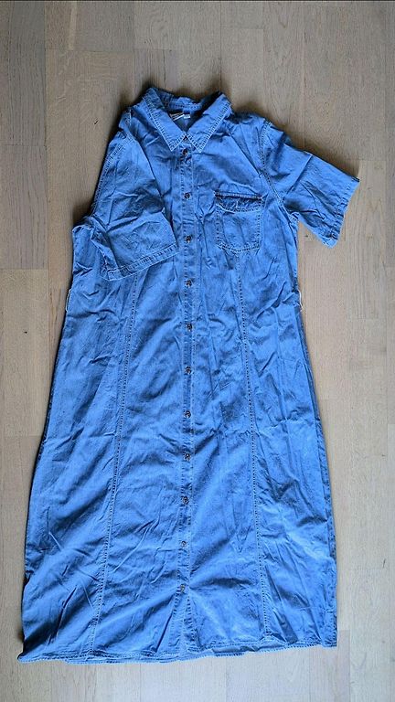Jauna džinsa kreklkleita,sūtīta no Vācijas.Audums plānais džinss,smuki izskatās virsū,garums 95cm,krūtīs 46x2cm,C&A.pārdodu,jo neder man.