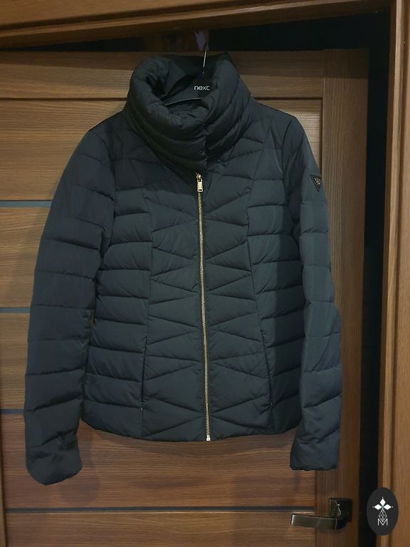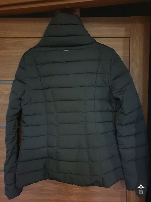Very warm winter down coat. With zipper closure and press studs. Belt, removable hood. Grayish brown. Worn for one season. The only noticeable flaw is that one button is missing, but otherwise it is in good condition.