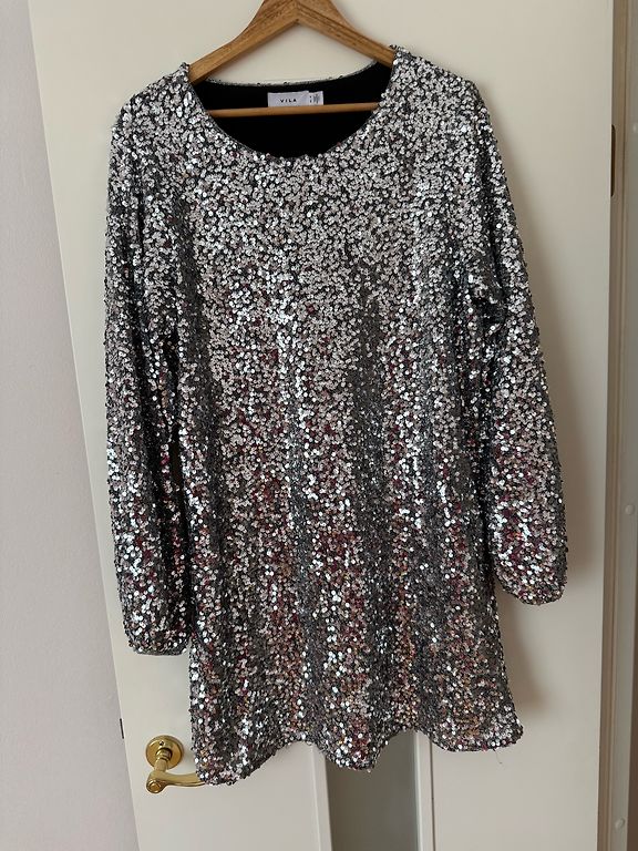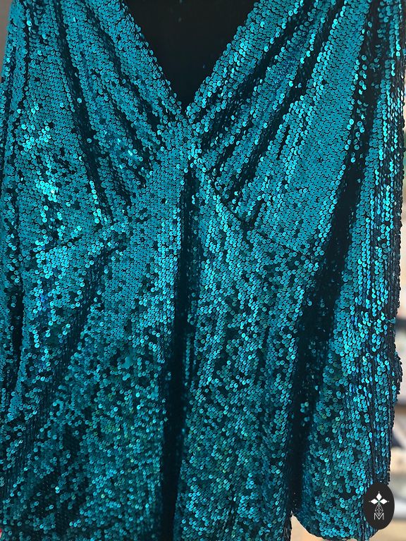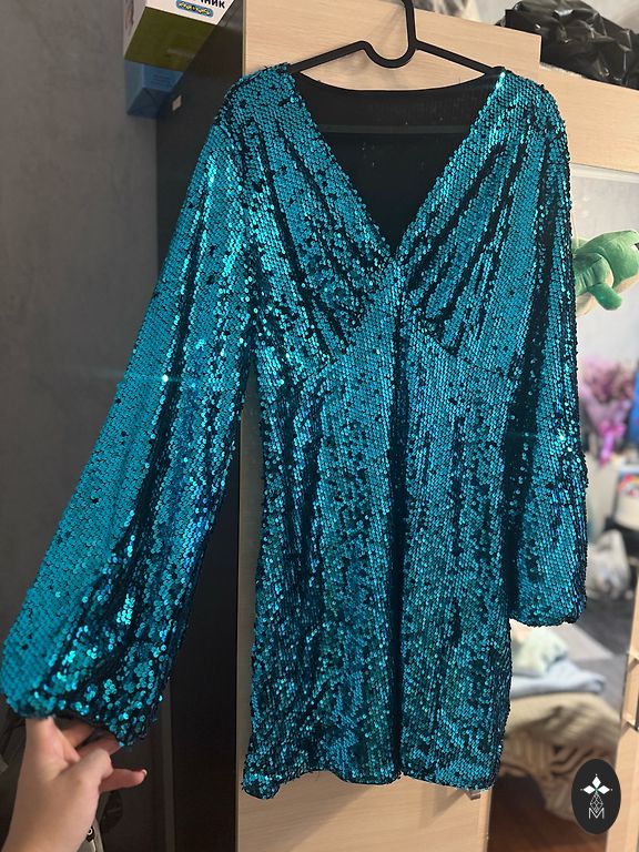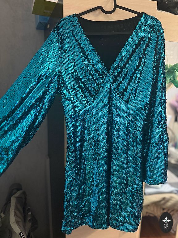 Graži suknelė, ryškiai smaragdo žalios spalvos su mėlynu raštu ir petnešėlėmis. Dėvėta du kartus. Ilgis apie 80 cm, krūtinė 42–43 cm, elastinga juosmens dalis.