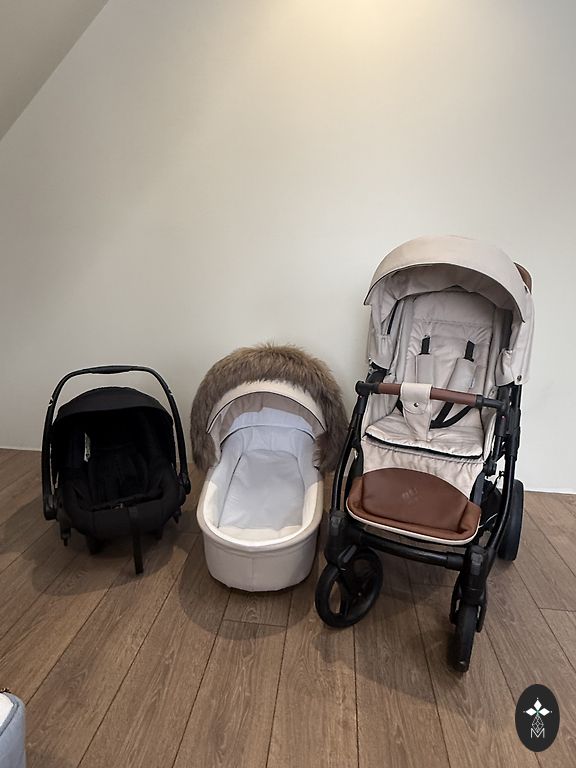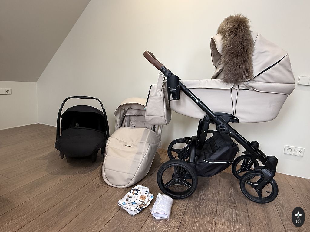 Naudoti vežimėliai puikios būklės. Vežimėlio lopšys, sėdimoji dalis, šiltas miegmaišis, kojos uždangalai lopšiui ir sėdimajai daliai, originalus tinklelis nuo uodų ir saulės uždangalas sėdimajai daliai, tinklelis nuo uodų ir saulės uždangalas lopšio daliai (ne originalūs). Užtrauktukai, lipukai ir sagtys veikia. Dažniausiai naudoti vaiko miegui terasoje. Nėra naminių gyvūnų ir vežimėliai laikomi šiltose patalpose. Šiek tiek saulė išblukino juodą audinio dalį (užtrauktukams), taip pat padangos nėra kaip naujos, bet viskas funkcionalu ir patogu pagal modelį.