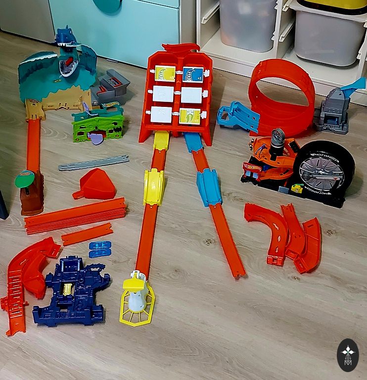 Kõik, mis fotol. Mõned rajad, autode kast, ühendusdetailid, sillad, hüpped, kiirendaja, silmus monster-truckidele, kallur-autode mägi.