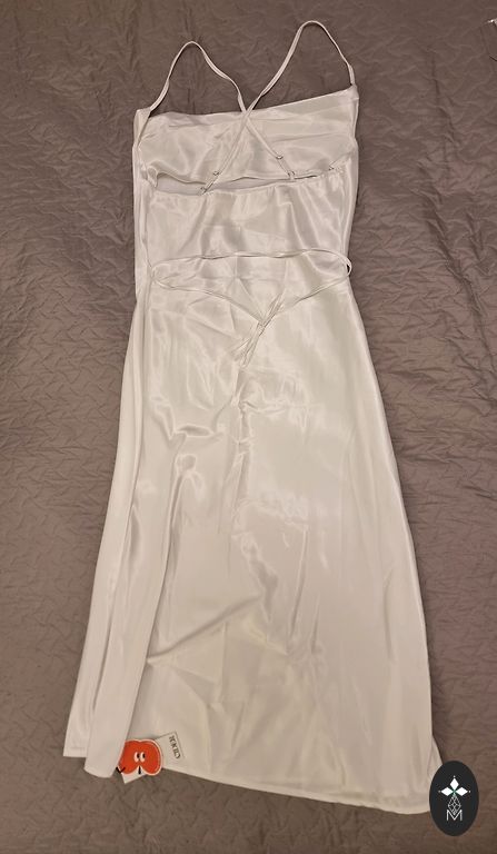 Слип платье, указано размер 44, но смотрите мерки. Лямки регулируемые, сбоку молния, кокетливый разрез, красиво выделенное декольте. Длина от подмышки 93 см; от подмышки до подмышки 51 см (немного регулируется, завязывая ленту); талия 43×2 см; бедра 54×2 см.