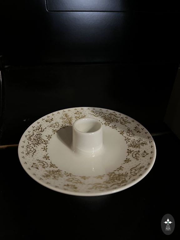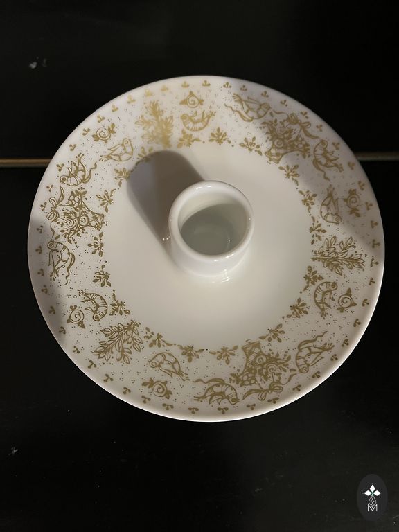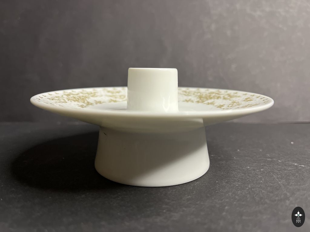 Skaists manufaktūras AL-KA KUNST porcelāna svečturis. Dekorēts ar zeltu un lustru. Zīmogs no 1935. gada. Bez lietošanas pazīmēm.