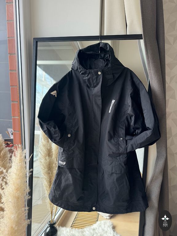 Plotis po pažastimis 74 cm, ilgis priekyje 79 cm, ilgis gale 84 cm. Kišenėlių uždarymai su magnetais.