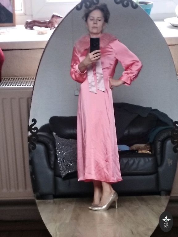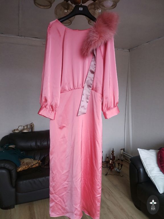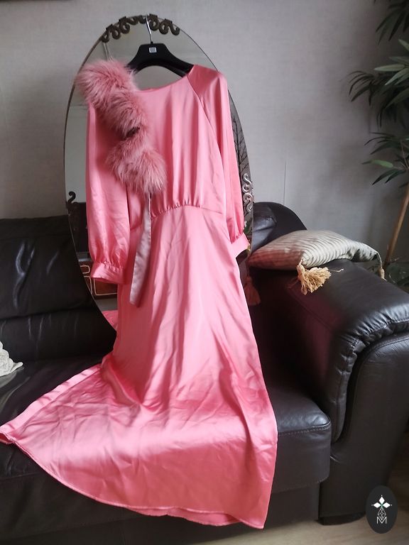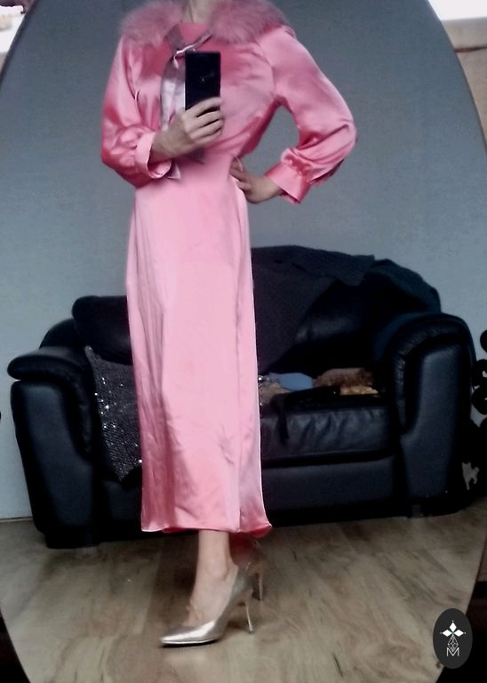 Zīdaina auduma kleita ar oderi, īpaši piemērota ziemas sezonai, bet der arī vasarai. Rāvējslēdzēja aizdare, garums no pleca līnijas - 96cm.