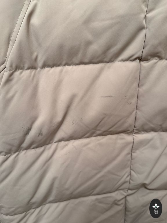 Very warm, down-filled, with natural fur on the hood. Size indicated as XS, but will also fit S/small M. There are defects; the zipper on the pocket needs repair.