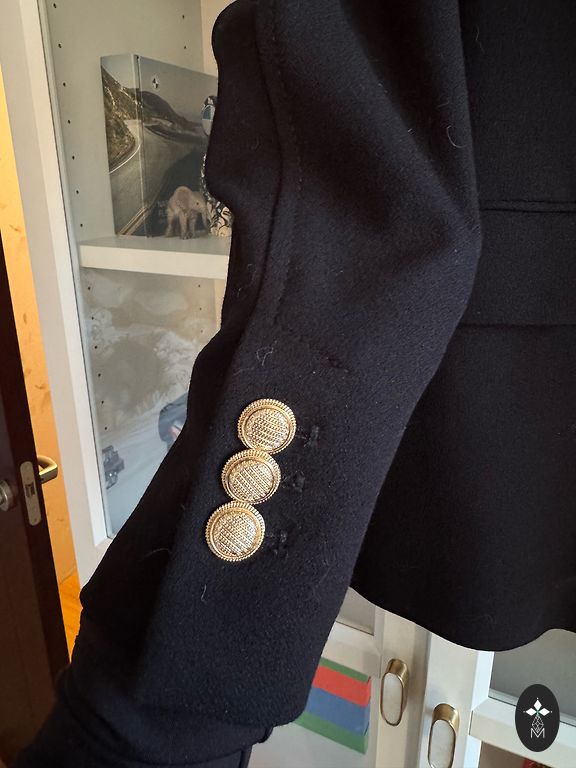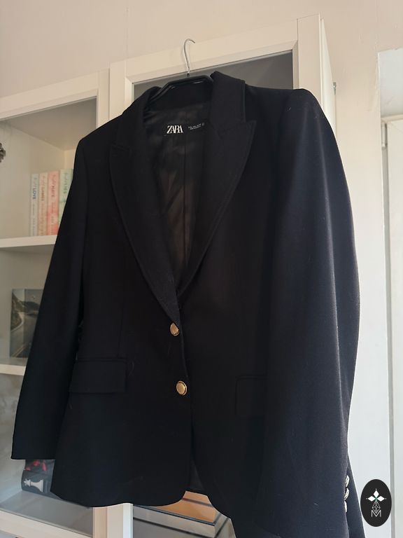 Eleganti kardiganas. Ilgis nuo peties 101 cm. Pečių plotis 41 cm. Rankovės ilgis nuo peties 60,5 cm. Be pamušalo. Pečiuose paminkštinimai. Šonuose kišenės (neatskleistos). Diržas komplekte. Atrodo, kad tinka L dydžiui. Siuntimas įskaičiuotas į kainą.
