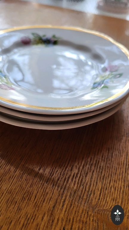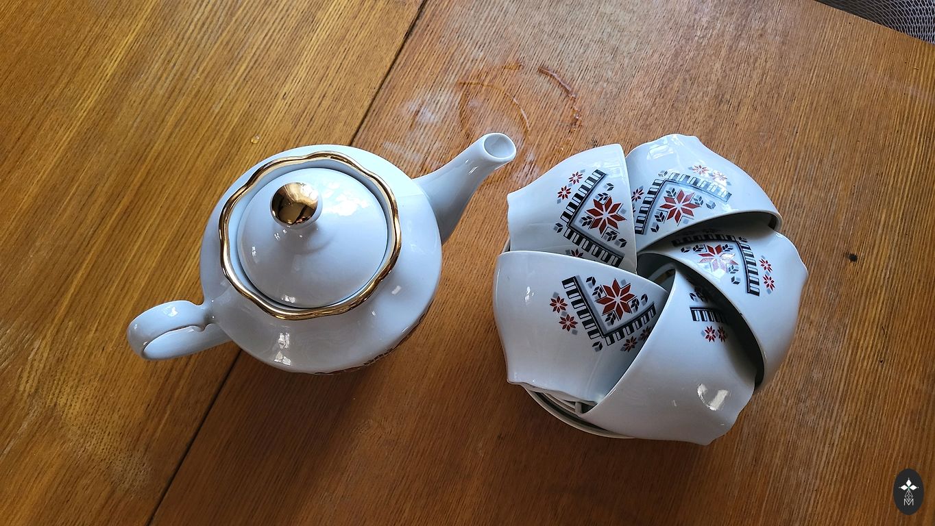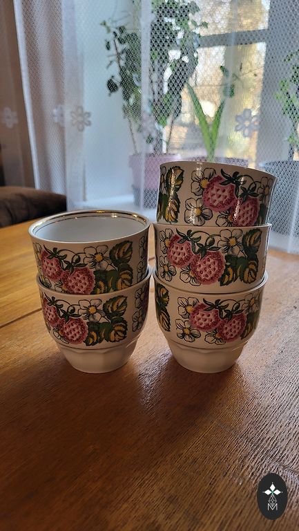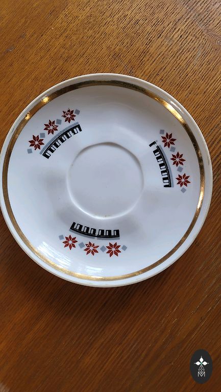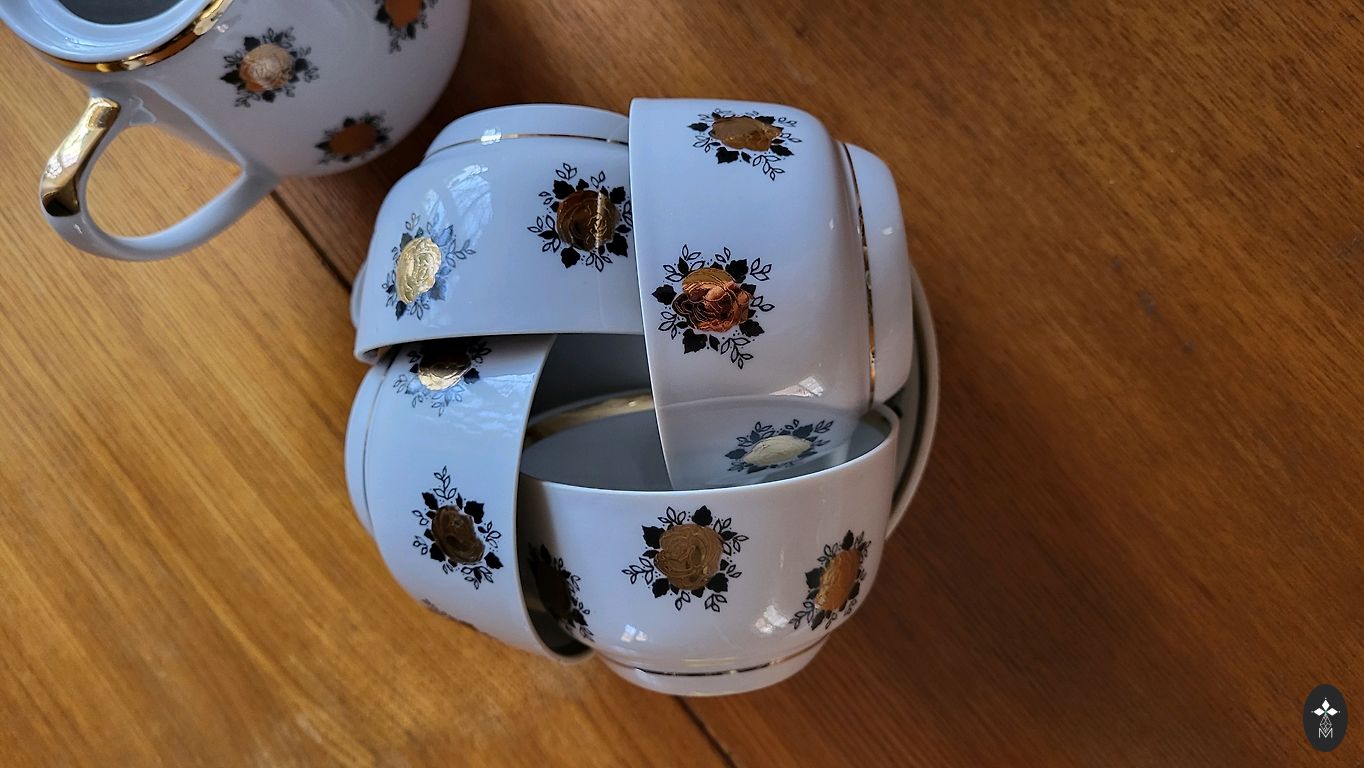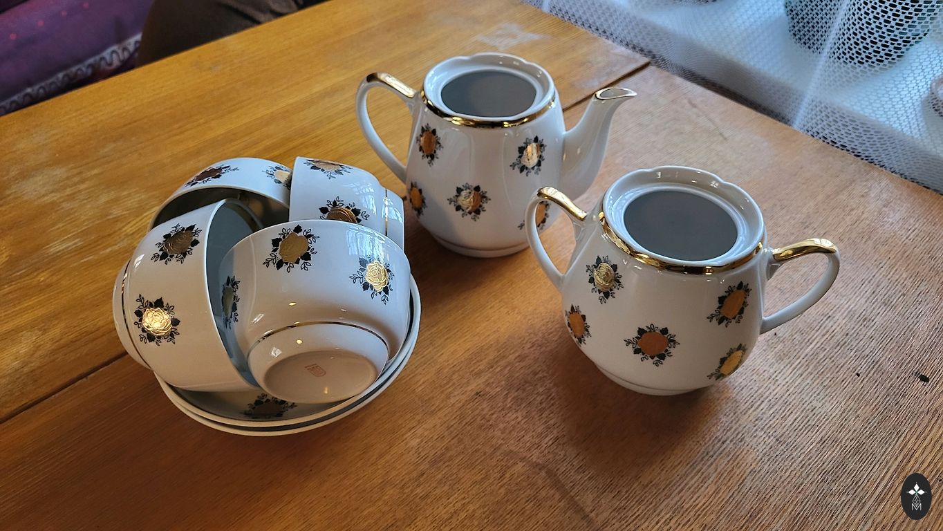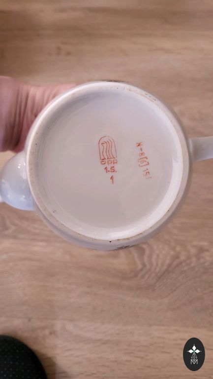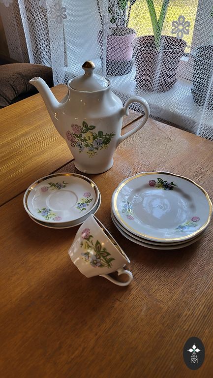 Servīze ļoti labā stāvoklī ,izņemot lielo kanniņu tur ir viens atsitums foto labi redzams .Citi trauki visi veseli un labi saglabājušies ,ar sarkanajiem zīmogiem, ja vēlaties varu piedāvāt arī mazo kafijas kannu,bez vāciņa bet pilnīgi vesela.