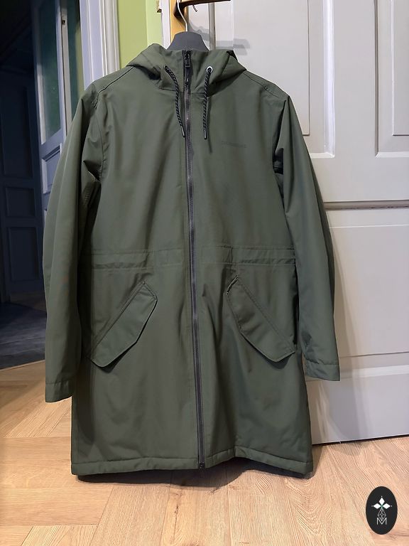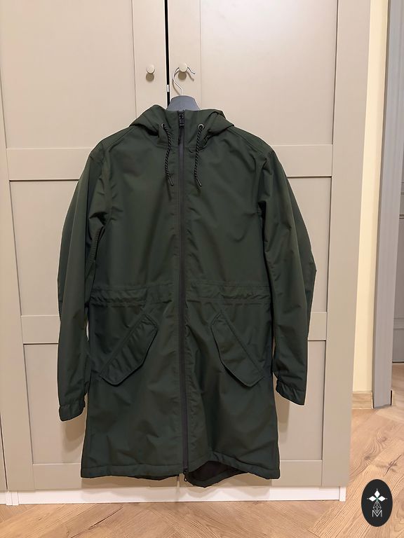 Labai madinga striukė iš kūrybingos vokiečių prekės ženklo „Annette Gortz“. Trapecijos formos siluetas, ilgesnė nugaros dalis, reguliuojamas nugaros plotis su raišteliu. Apykaklę galima nešioti įvairiais būdais. Ilgis po krūtine 50 cm, priekinis ilgis 65 cm, nugaros ilgis 72 cm. Modelis Claro. Medžiaga yra mėlynai pilkos spalvos, šilta, stora. Vėlyvas ruduo, žiema. Nedideli nusidėvėjimo ženklai.