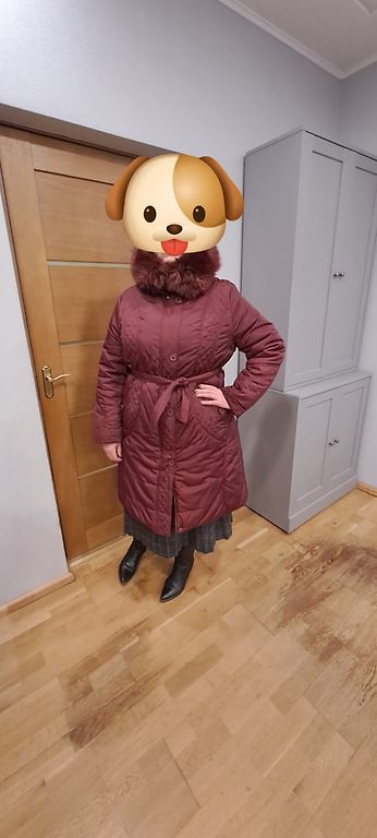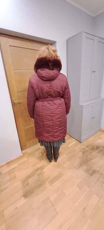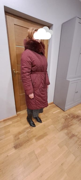 Mētelis ar kapuci, spiedpogas, izturīgs rāvējslēdzējs, stepēts, pildījumā dūnas. plecos 60cm , krūtīs 65,garums 122 cm.