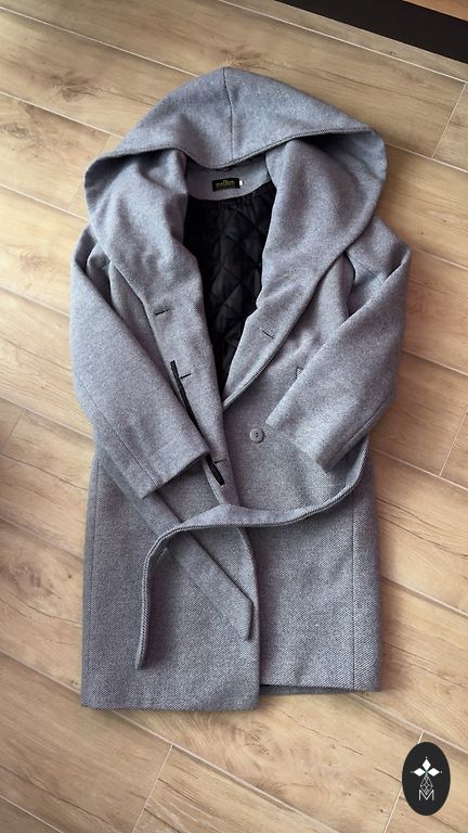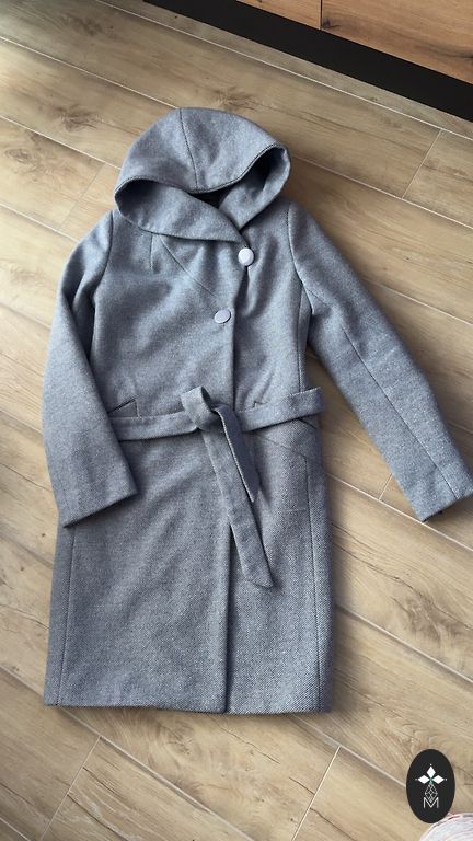 Klassikaline villane mantel taskute ja kapuutsiga. Laius õlgade vahel 40 cm, kaenlaaluste vahel 51 cm, talje 51 cm, puusad 57 cm, pikkus õlast 98 cm, varruka pikkus õlast 65 cm.