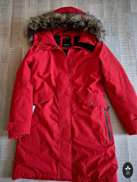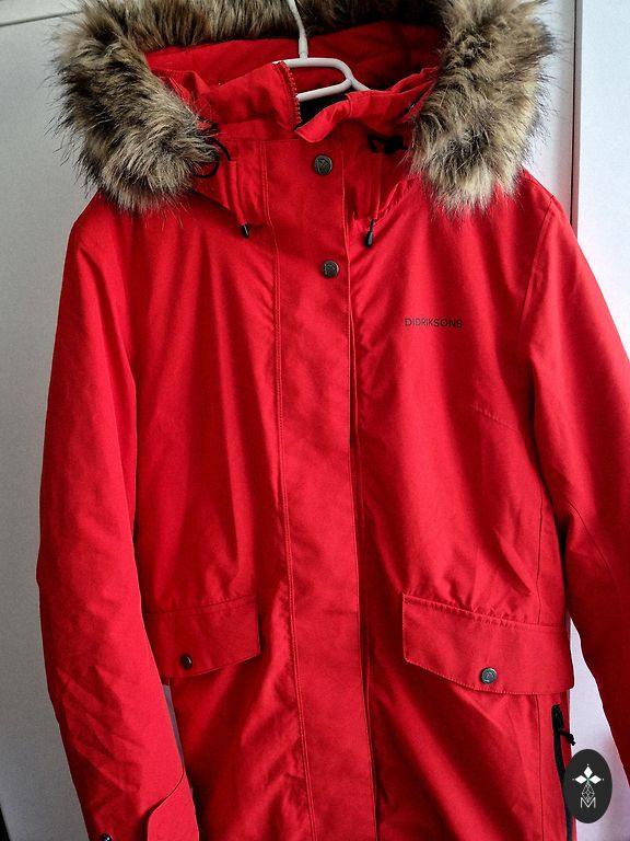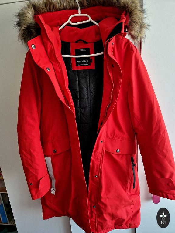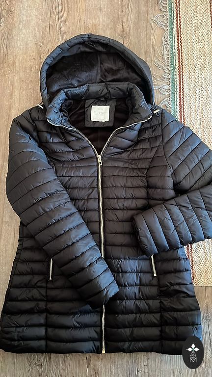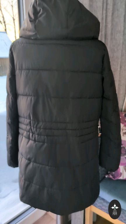 Теплая куртка на рост. Размер M, но если нравится немного свободы, думаю, подойдет и для размера S. У меня сейчас между M и L, и куртка довольно тесная - толстый свитер под нее не надеть. Цвет очень темно-синий, почти черный (в зависимости от освещения). Носилась немного, дефектов нет. Единственный