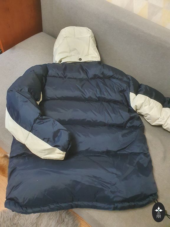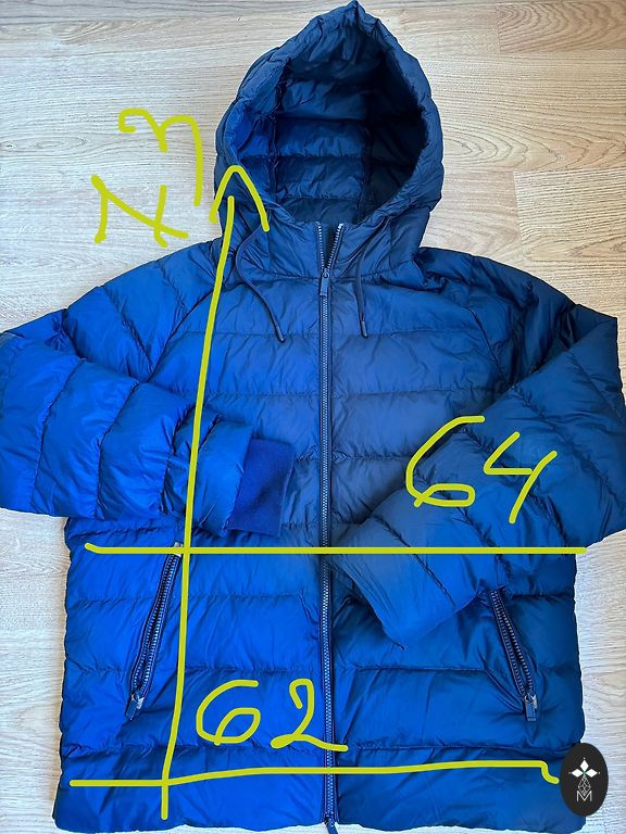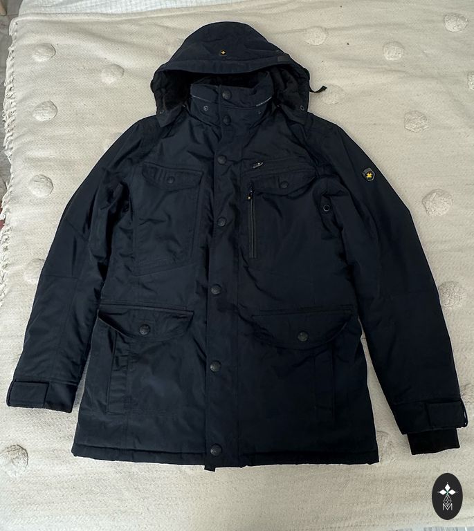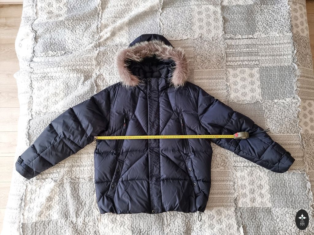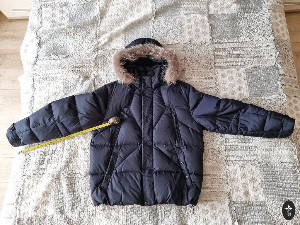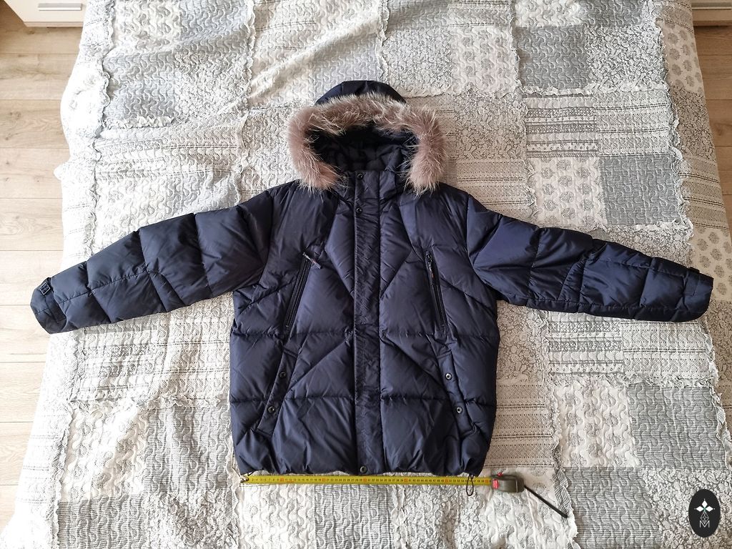 Размер M/EU48. Темно-синий. Все размеры на фотографиях. Очень легкая, качественная, дышащая подкладка. У одного кармана немного потертый край, но при ношении это не видно. Капюшон из натурального меха, съемный.