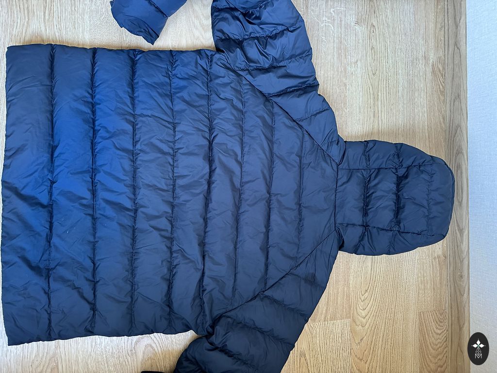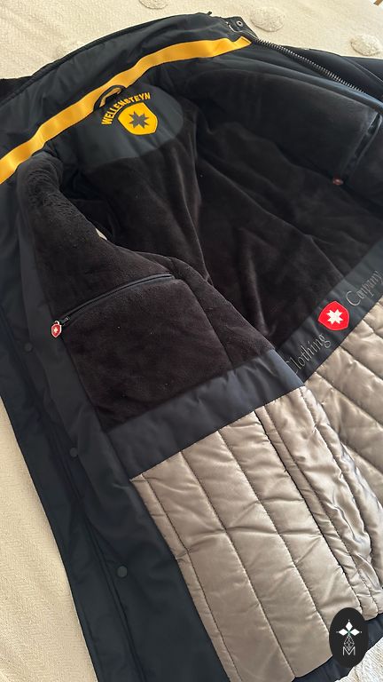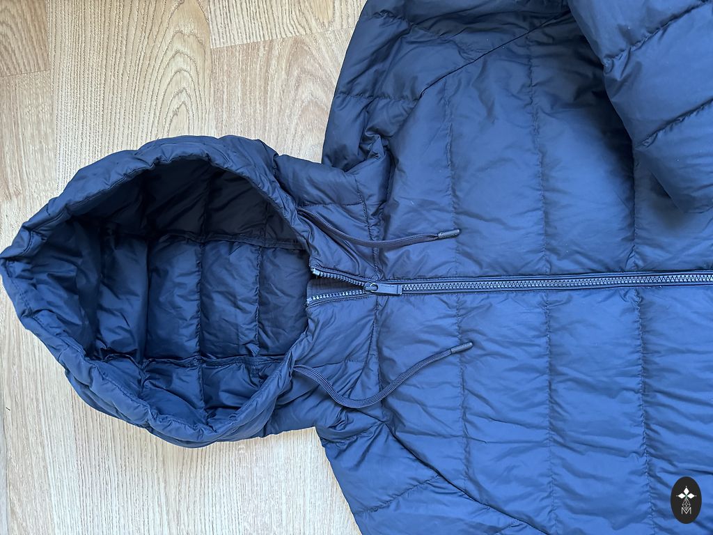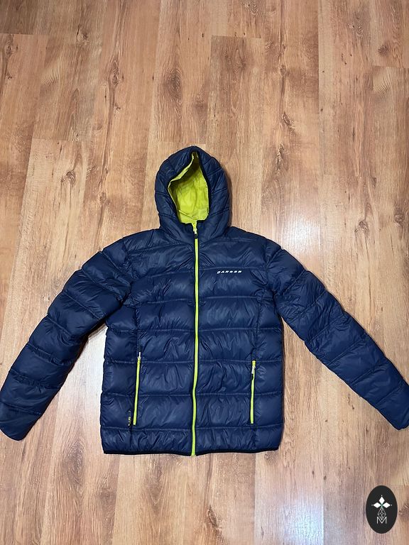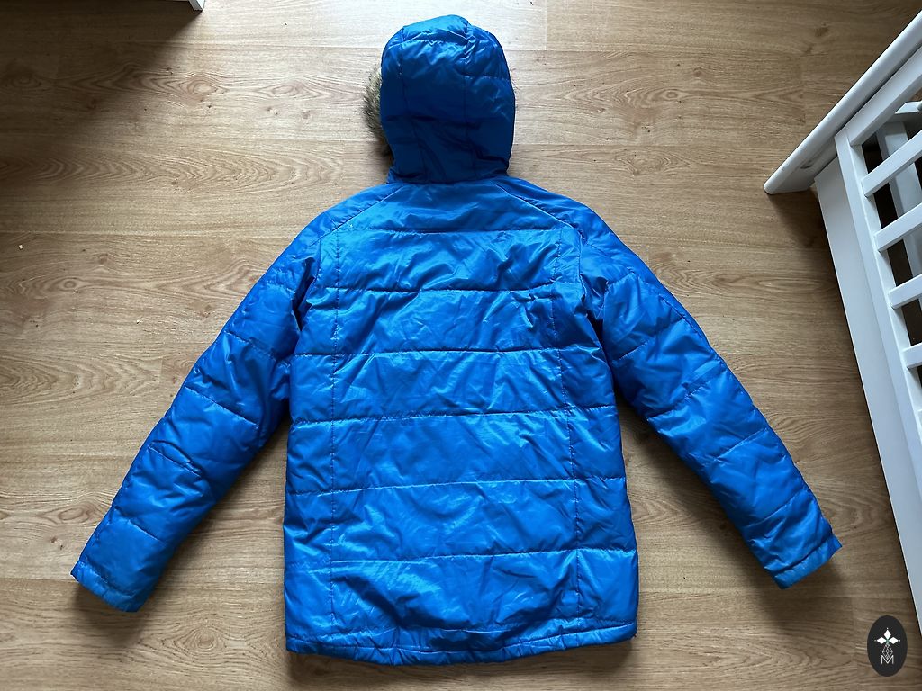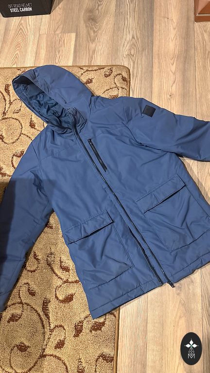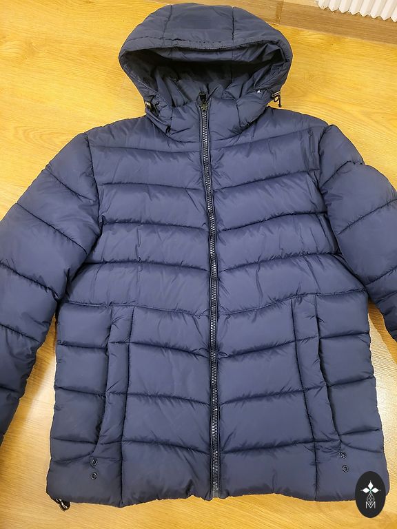Размер M/EU48. Темно-синий. Все размеры на фотографиях. Очень легкая, качественная, дышащая подкладка. У одного кармана немного потертый край, но при ношении это не видно. Капюшон из натурального меха, съемный.