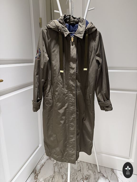 Length from shoulder - 85 cm, chest circumference - 90 cm, waist - max. 76 cm. Hood with tieable pom-poms made of natural fox fur. The hood is missing one button. Two-way zipper from top and bottom, hidden deep pockets, includes a belt.