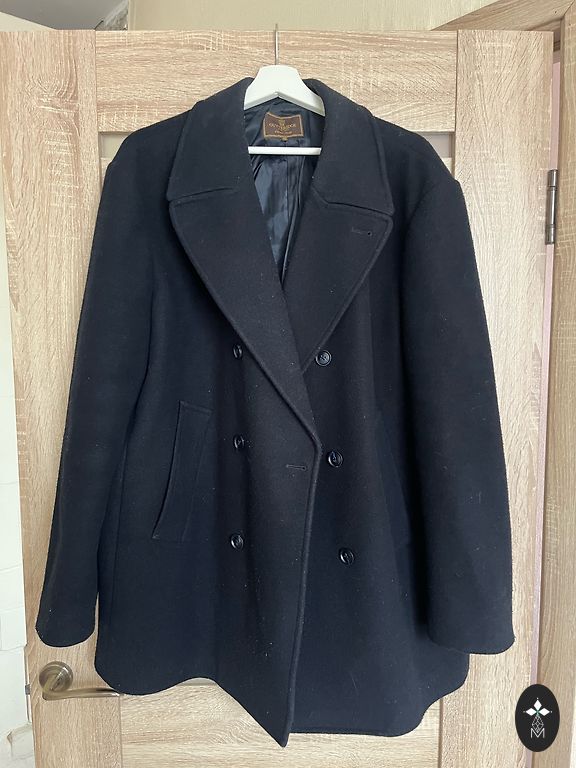 Dark blue men's coat with insulation. Stand-up collar, chest 66x2 cm, sleeve length 68 cm, coat length - 120 cm. With snap buttons. There are two pockets outside and one inside pocket. Well crafted. + shipping. Material - raincoat fabric.