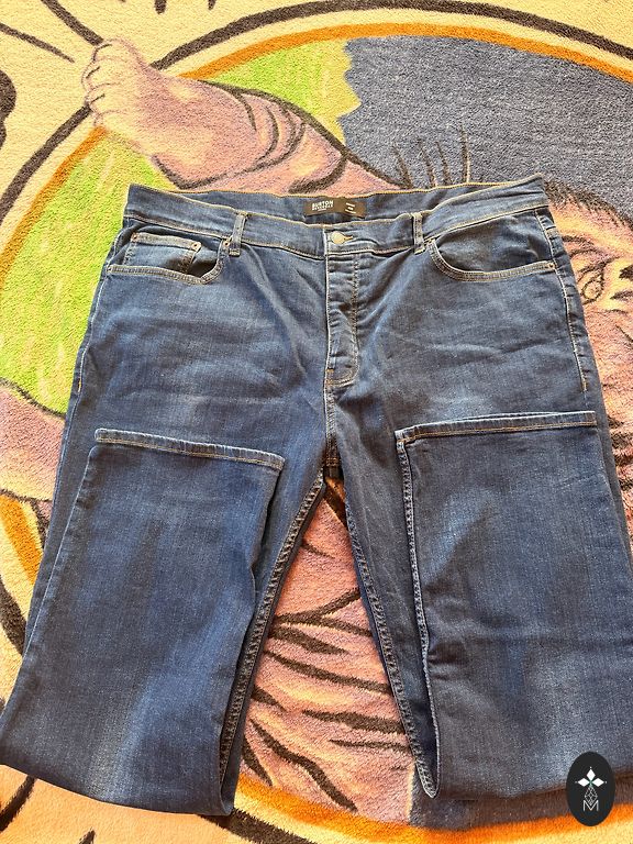 Kelios kartus užvilktos kelnės. Tamprios džinsinės kelnės.