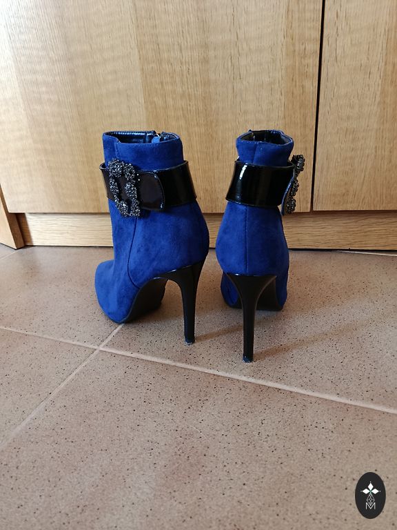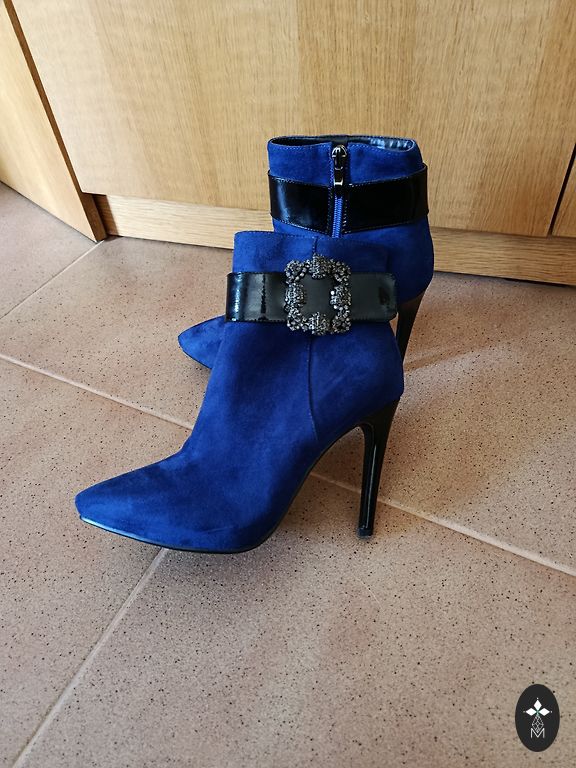 Размер 38. У одного каблука откололся кусочек (см. на последнем фото) и немного потерся материал у верхнего шва, при носке не видно и ничем не мешает.