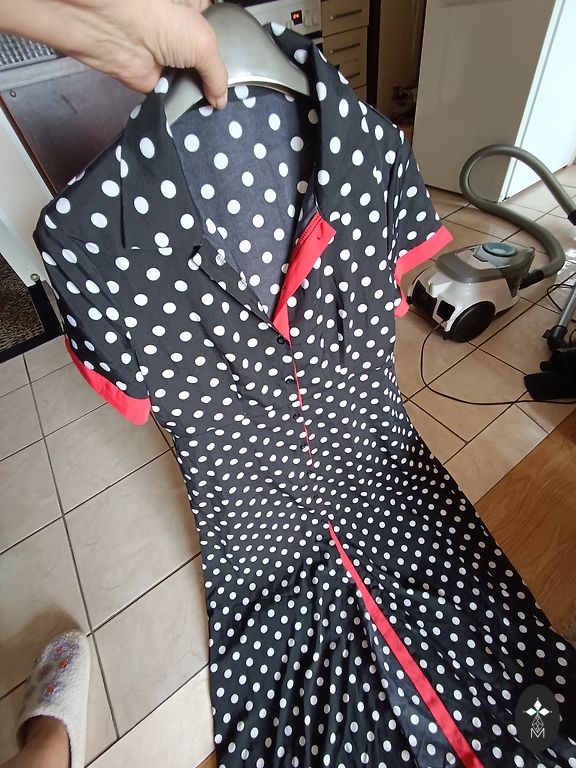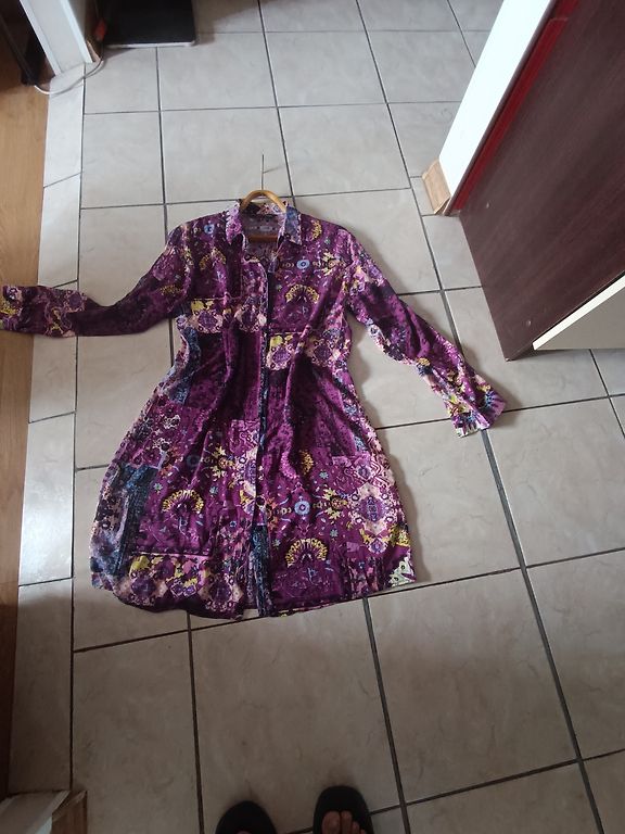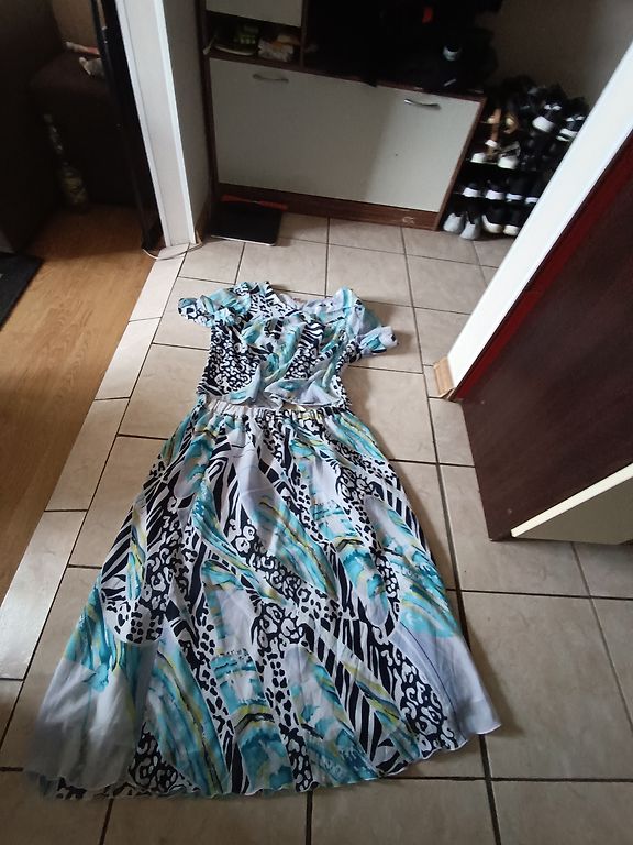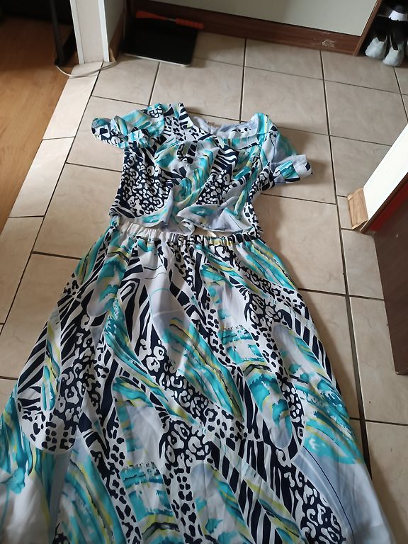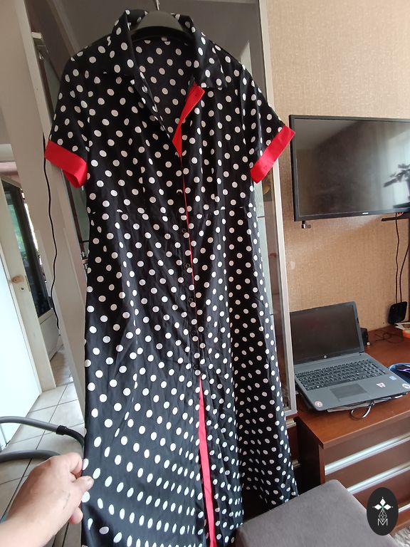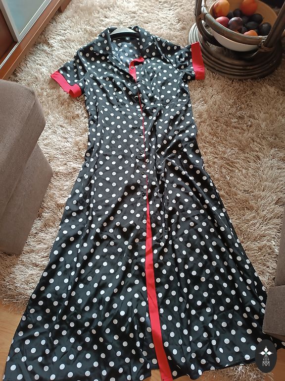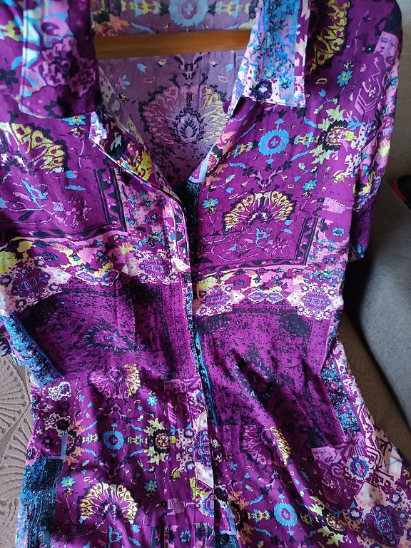 Supermiksta, elastiga, neburziga rudens kleitina. Ar 3/4 dalu piedurknem un dekorativu elementu kakla dala. Krutis 114, padodas, garums 102 cm.