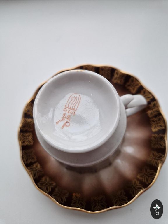For sale, a gorgeous coffee set ĀRIJA with pink flowers and gold. Red stamps. Excellent condition. Gold preserved 100%.