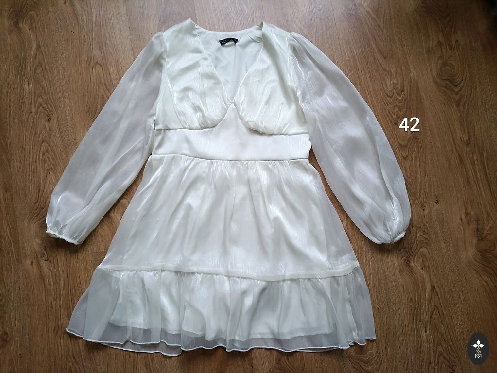 Įdomaus dizaino suknelė, maloni medžiaga, originalus kirpimas. Klubai 103 cm, krūtinė 96 cm, ilgis 93 cm, dydis 46/48 (Celbes)