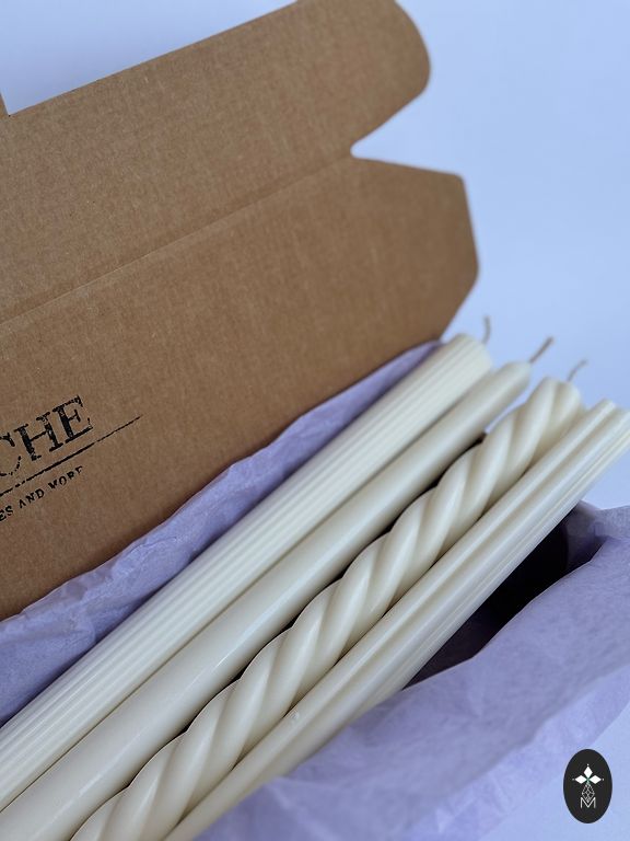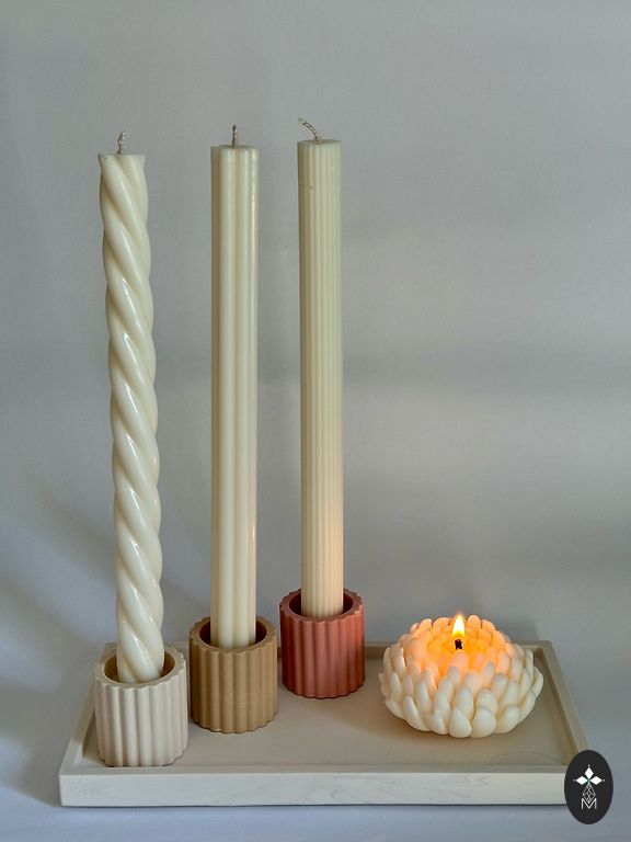 Large grooved standing candles: size M - €12.00, size L - €16.00. When purchased together as a set - €25. Finely grooved standing candle - €8.00 Grooved thin table candle - €3.50