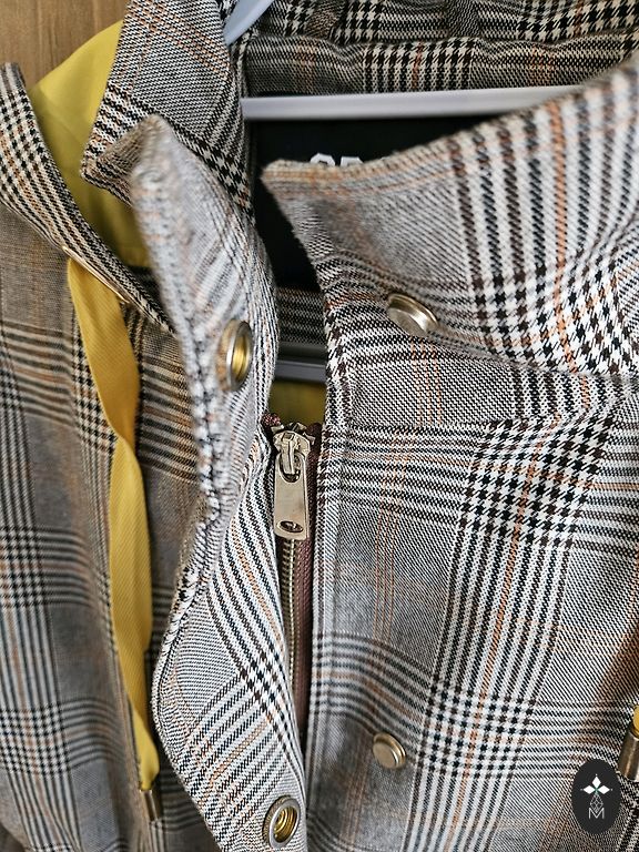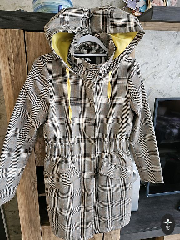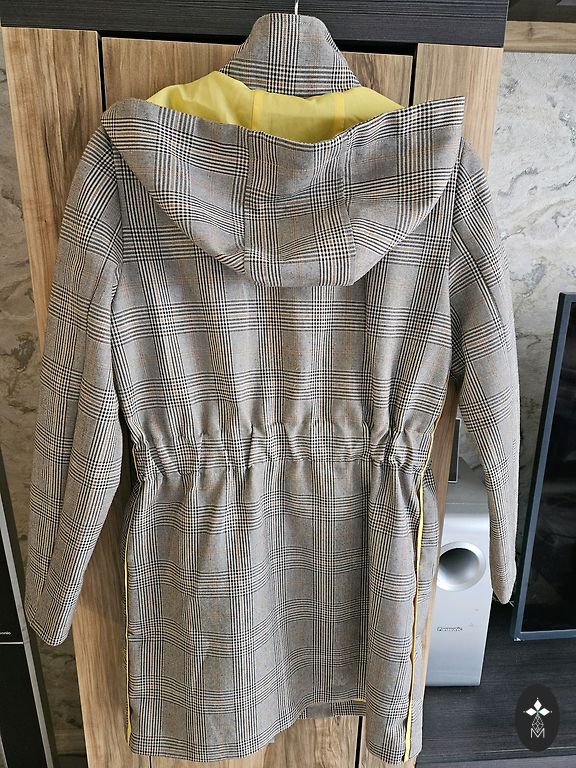 Pruun kangast mantel mustade kunstkarusnahast mansettidega. Nööbid puuduvad, vöö rõhutab naiselikku elegantsi. Kanga koostis: 75% polüester, 25% vill. Mantli pikkus 107 cm; varruka pikkus 53 cm. Lisatasu eest 10 € lisan fotol näidatud siidist sall. Ostetud spetsiaalselt selle mantli jaoks. Transpordikulu ei ole hinna sees.